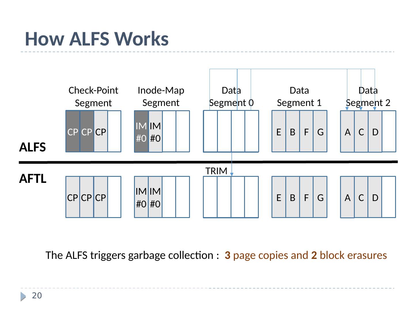 20 .How ALFS Works 20 ALFS AFTL Check-Point Segment Inode-Map Segment CP IM #0 CP IM #0 CP CP IM #0 CP CP A B C D IM #0 CP E B F G IM #0 CP Data Segment 0 Data Segment 1 Data Segment 2 A B C D E B F G B A C D A C D A B C D TRIM A C D The ALFS triggers garbage collection : 3 page copies and 2 block erasures