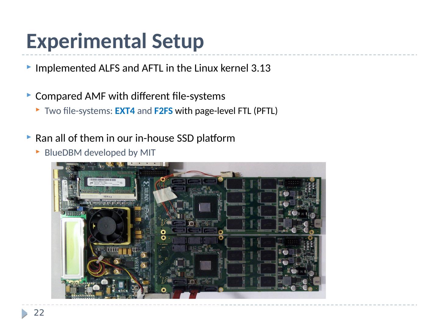 22 .Experimental Setup 22 Implemented ALFS and AFTL in the Linux kernel 3.13 Compared AMF with different file-systems Two file-systems: EXT4 and F2FS with page-level FTL (PFTL) Ran all of them in our in-house SSD platform BlueDBM developed by MIT