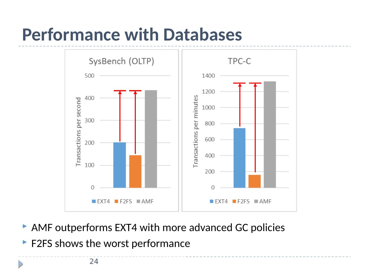 24 .Performance with Databases 24 AMF outperforms EXT4 with more advanced GC policies F2FS shows the worst performance