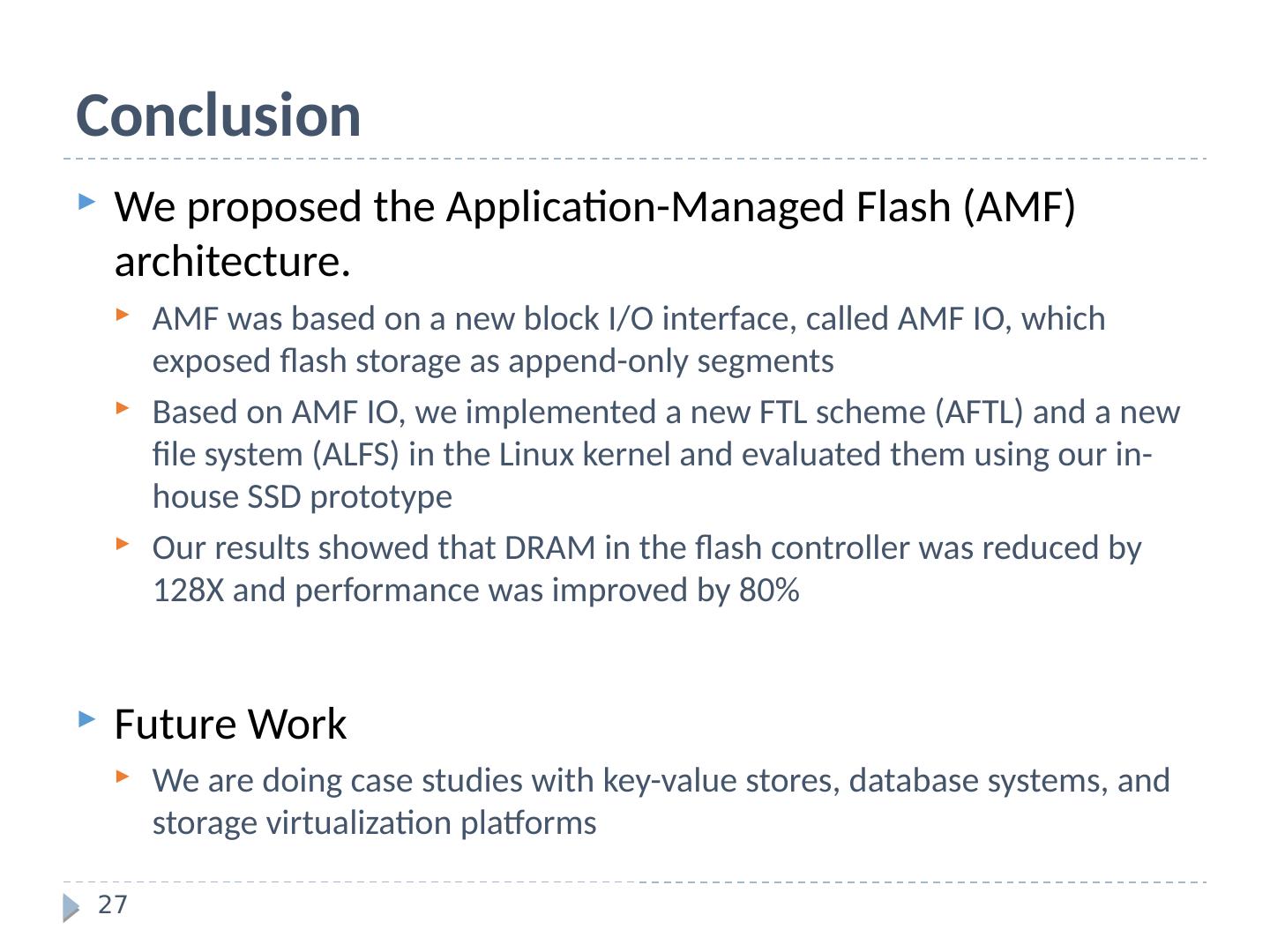 27 .Conclusion 27 We proposed the Application-Managed Flash (AMF) architecture. AMF was based on a new block I/O interface, called AMF IO, which exposed flash storage as append-only segments Based on AMF IO, we implemented a new FTL scheme (AFTL) and a new file system (ALFS) in the Linux kernel and evaluated them using our in-house SSD prototype Our results showed that DRAM in the flash controller was reduced by 128X and performance was improved by 80 % Future Work We are doing case studies with key-value stores, database systems, and storage virtualization platforms