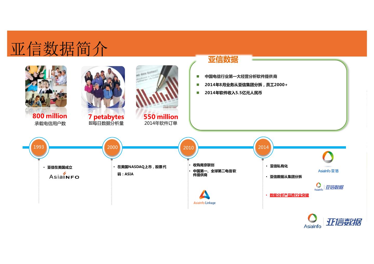 2 .亚信数据简介 亚信数据 n 中国电信行业第一大经营分析软件提供 商 n 2014年8月业务从亚信集团分拆,员工2000+ n 2014年软件收入5.5亿元人民币 800 million 7 petabytes 550 million 承载电信用户数 BI每日数据分析量 2014年软件订单 1993 2000 2010 2014 • 收购南京联创 • 亚信私有化 • 亚信在美国成立 • 在美国NASDAQ上市,股票 代 • 中国第一、全球第二电信 软 码:ASIA 件提供商 • 亚信数据从集团分拆 • 数据分析产品跨行业突破
