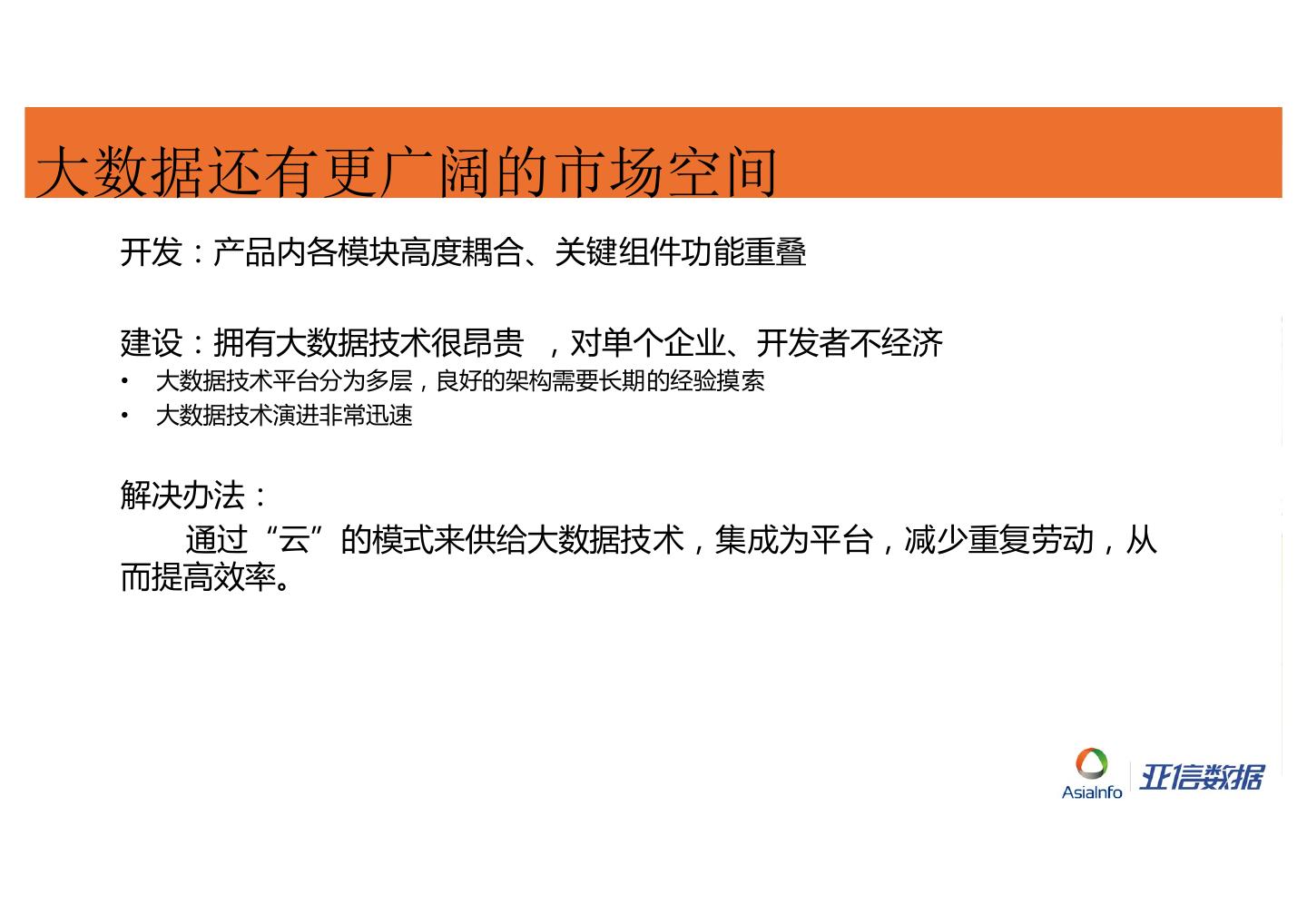 4 .大数据还有更广阔的市场空间 开发:产品内各模块高度耦合、关键组件功能重叠 建设:拥有大数据技术很昂贵 ,对单个企业、开发者不经济 • 大数据技术平台分为多层,良好的架构需要长期的经验摸索 • 大数据技术演进非常迅速 解决办法: 通过“云”的模式来供给大数据技术,集成为平台,减少重复劳动,从 而提高效率。