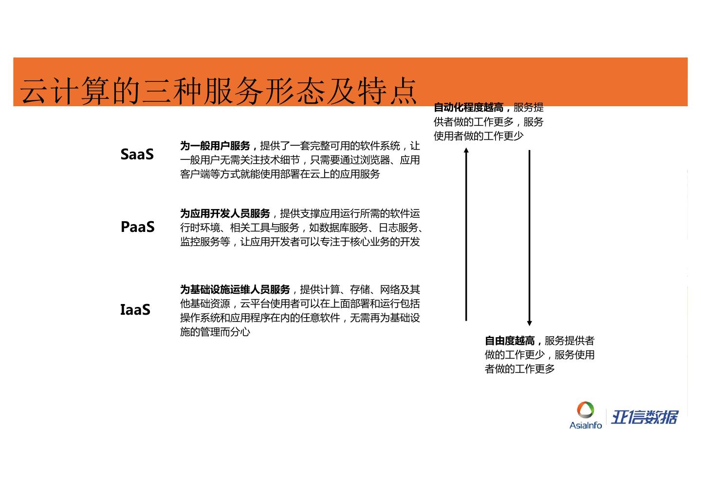 5 .云计算的三种服务形态及特点 自动化程度越高,服务提 供者做的工作更多,服务 使用者做的工作更少 为一般用户服务,提供了一套完整可用的软件系统,让 SaaS 一般用户无需关注技术细节,只需要通过浏览器、应用 客户端等方式就能使用部署在云上的应用服务 为应用开发人员服务,提供支撑应用运行所需的软件运 PaaS 行时环境、相关工具与服务,如数据库服务、日志服务、 监控服务等,让应用开发者可以专注于核心业务的开发 为基础设施运维人员服务,提供计算、存储、网络及其 他基础资源,云平台使用者可以在上面部署和运行包括 IaaS 操作系统和应用程序在内的任意软件,无需再为基础设 施的管理而分心 自由度越高,服务提供者 做的工作更少,服务使用 者做的工作更多