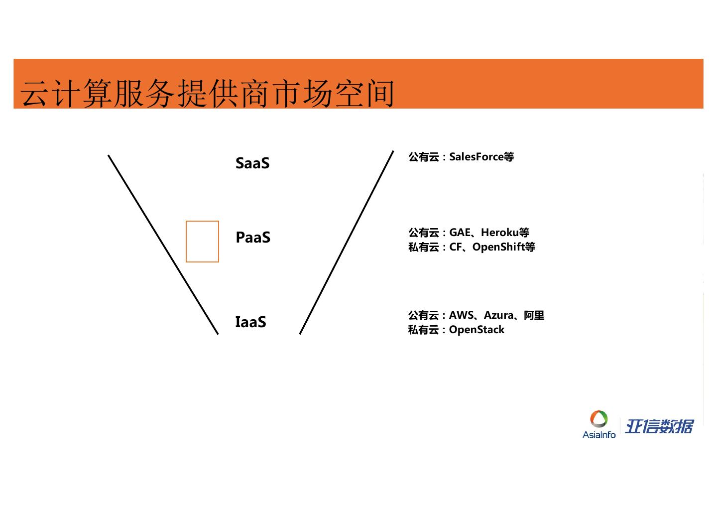 6 .云计算服务提供商市场空间 公有云:SalesForce等 SaaS 公有云:GAE、Heroku等 PaaS 私有云:CF、OpenShift等 公有云:AWS、Azura、阿里 IaaS 私有云:OpenStack