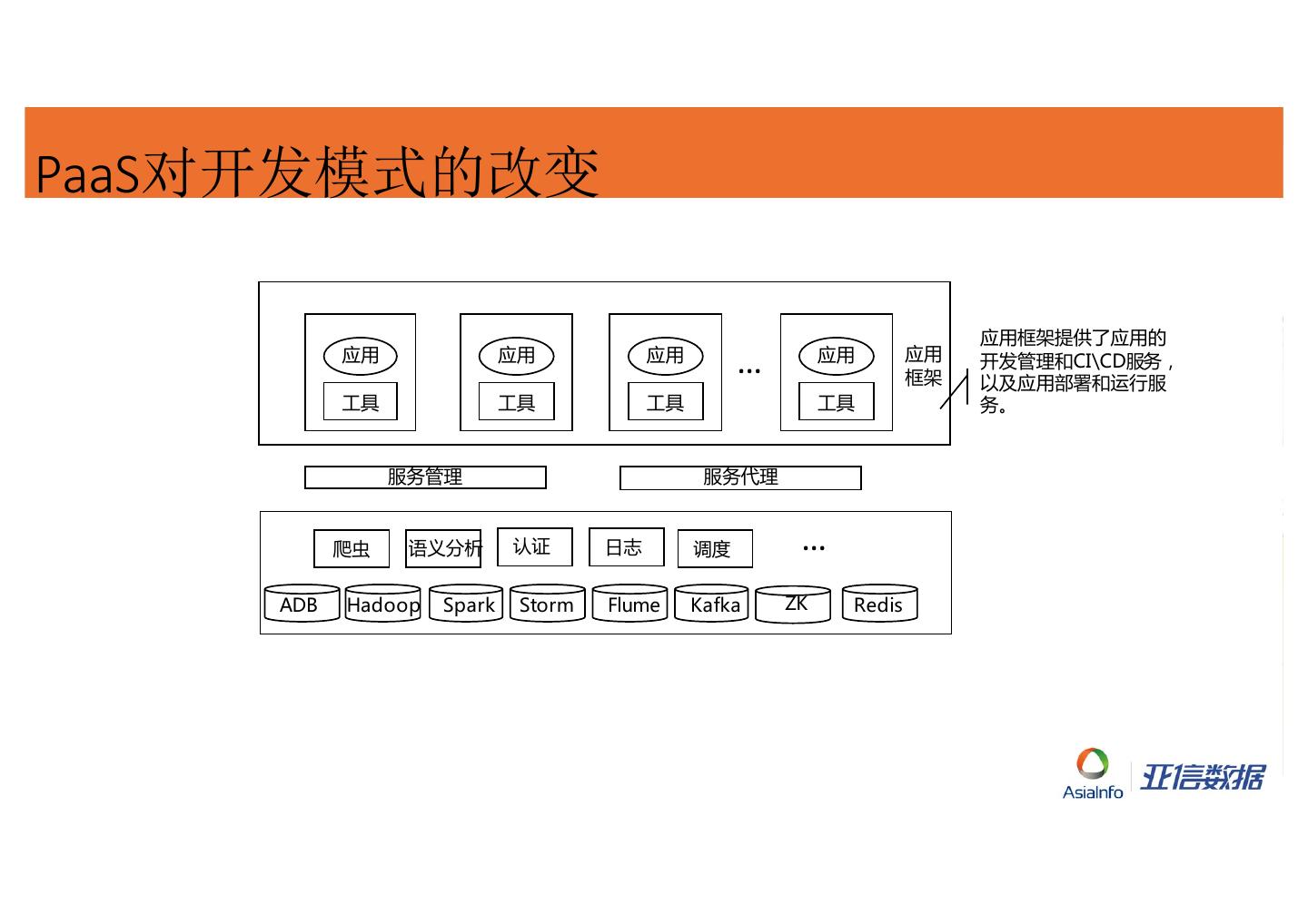 7 .PaaS对开发模式的改变 应用框架提供了应用的 应用 应用 应用 … 应用 应用 框架 开发管理和CI\CD服务, 以及应用部署和运行服 工具 工具 工具 工具 务。 服务管理 服务代理 爬虫 语义分析 认证 日志 调度 … ADB Hadoop Spark Storm Flume Kafka ZK Redis