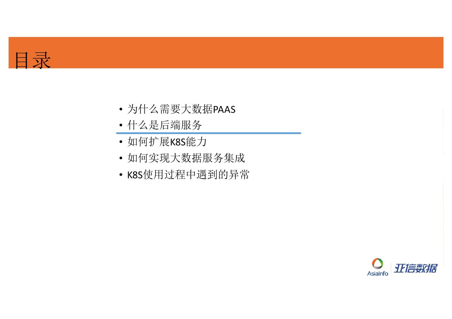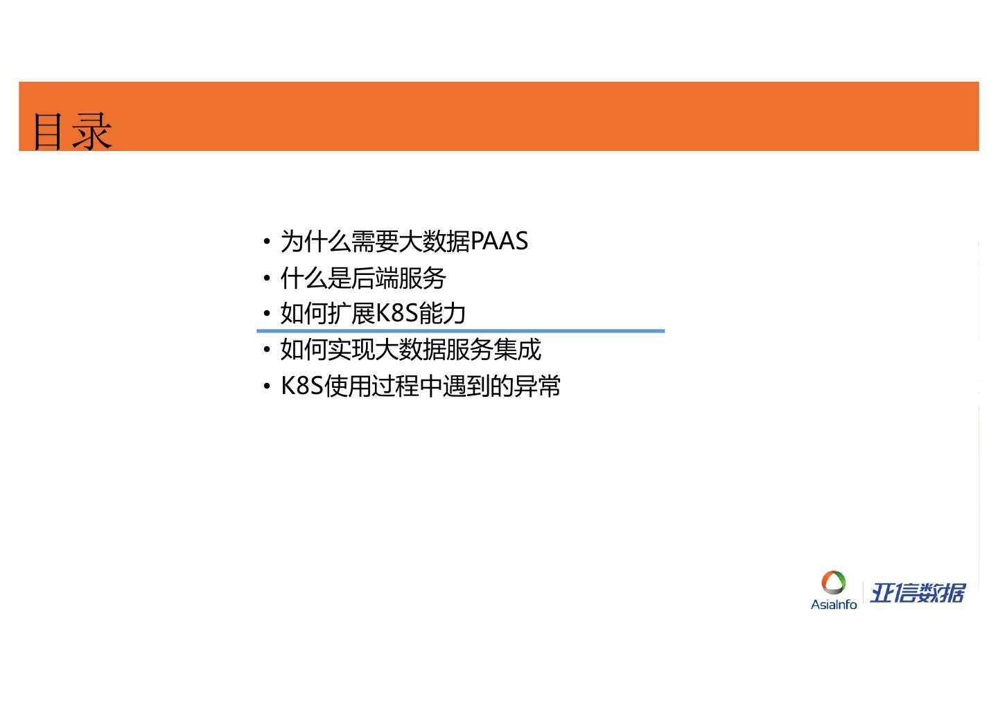 3 .目录 • 为什么需要大数据PAAS • 什么是后端服务 • 如何扩展K8S能力 • 如何实现大数据服务集成 • K8S使用过程中遇到的异常