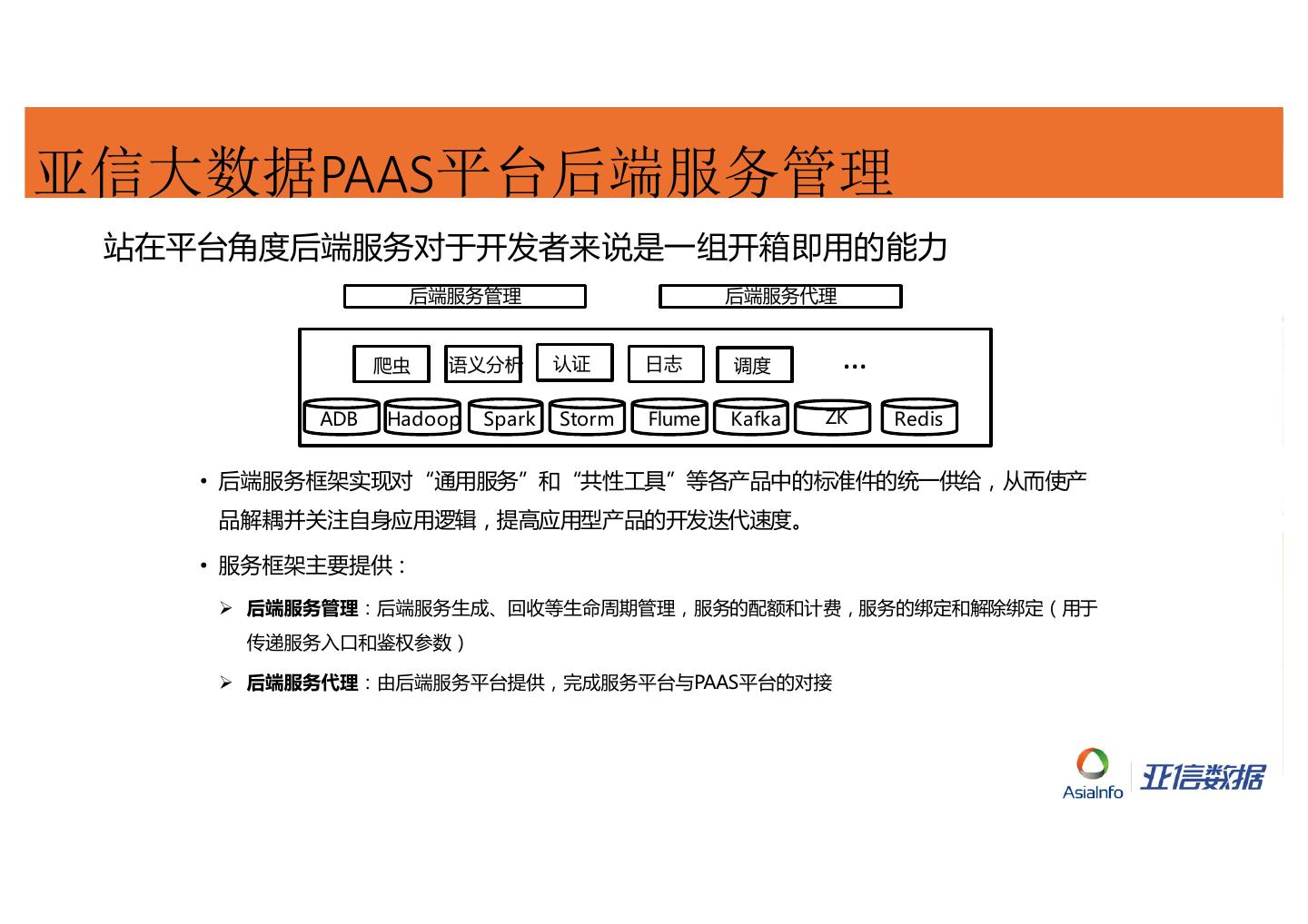 10 .亚信大数据PAAS平台后端服务管理 站在平台角度后端服务对于开发者来说是一组开箱即用的能力 后端服务管理 后端服务代理 爬虫 语义分析 认证 日志 调度 … ADB Hadoop Spark Storm Flume Kafka ZK Redis • 后端服务框架实现对“通用服务”和“共性工具”等各产品中的标准件的统一供给,从而使产 品解耦并关注自身应用逻辑,提高应用型产品的开发迭代速度。 • 服务框架主要提供: Ø 后端服务管理:后端服务生成、回收等生命周期管理,服务的配额和计费,服务的绑定和解除绑定(用于 传递服务入口和鉴权参数) Ø 后端服务代理:由后端服务平台提供,完成服务平台与PAAS平台的对接