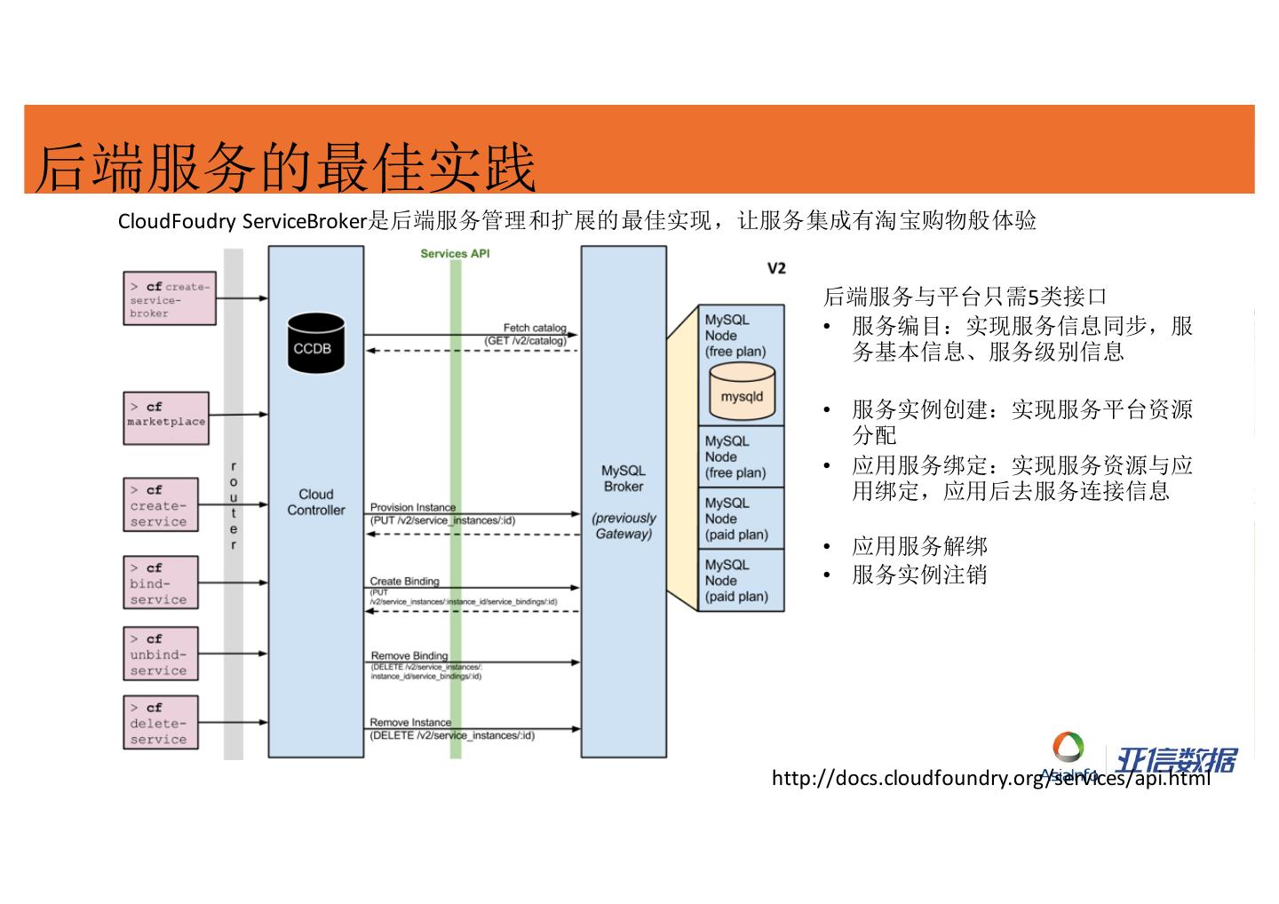 11 .后端服务的最佳实践 CloudFoudry ServiceBroker是后端服务管理和扩展的最佳实现,让服务集成有淘宝购物般体验 后端服务与平台只需5类接口 • 服务编目:实现服务信息同步,服 务基本信息、服务级别信息 • 服务实例创建:实现服务平台资源 分配 • 应用服务绑定:实现服务资源与应 用绑定,应用后去服务连接信息 • 应用服务解绑 • 服务实例注销 http://docs.cloudfoundry.org/services/api.html