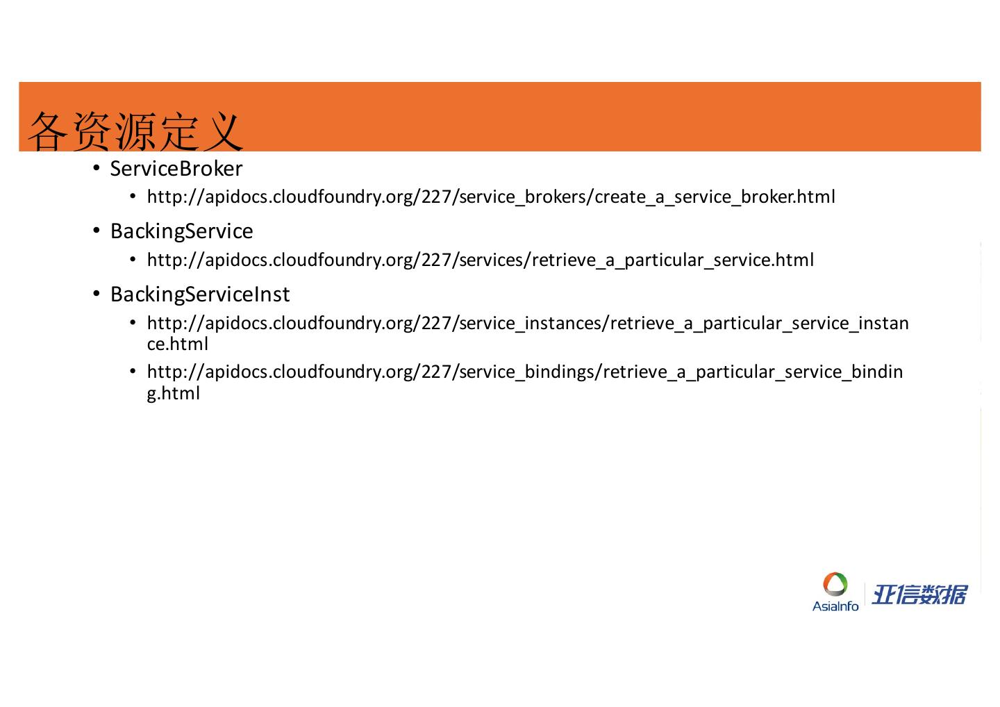 22 .各资源定义 • ServiceBroker • http://apidocs.cloudfoundry.org/227/service_brokers/create_a_service_broker.html • BackingService • http://apidocs.cloudfoundry.org/227/services/retrieve_a_particular_service.html • BackingServiceInst • http://apidocs.cloudfoundry.org/227/service_instances/retrieve_a_particular_service_instan ce.html • http://apidocs.cloudfoundry.org/227/service_bindings/retrieve_a_particular_service_bindin g.html