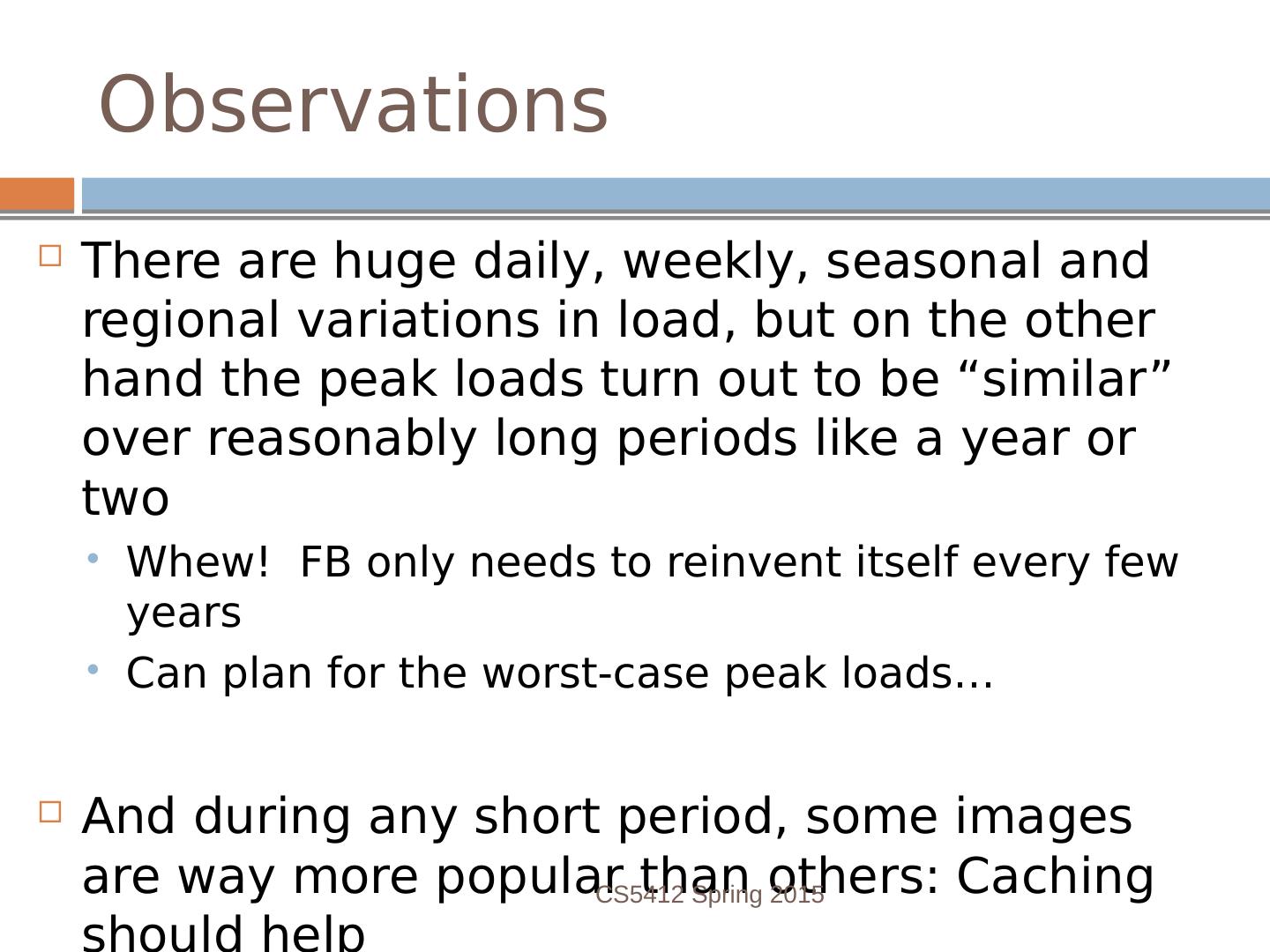 6 .Observations There are huge daily, weekly, seasonal and regional variations in load, but on the other hand the peak loads turn out to be “similar” over reasonably long periods like a year or two Whew! FB only needs to reinvent itself every few years Can plan for the worst-case peak loads… And during any short period, some images are way more popular than others: Caching should help CS5412 Spring 2015