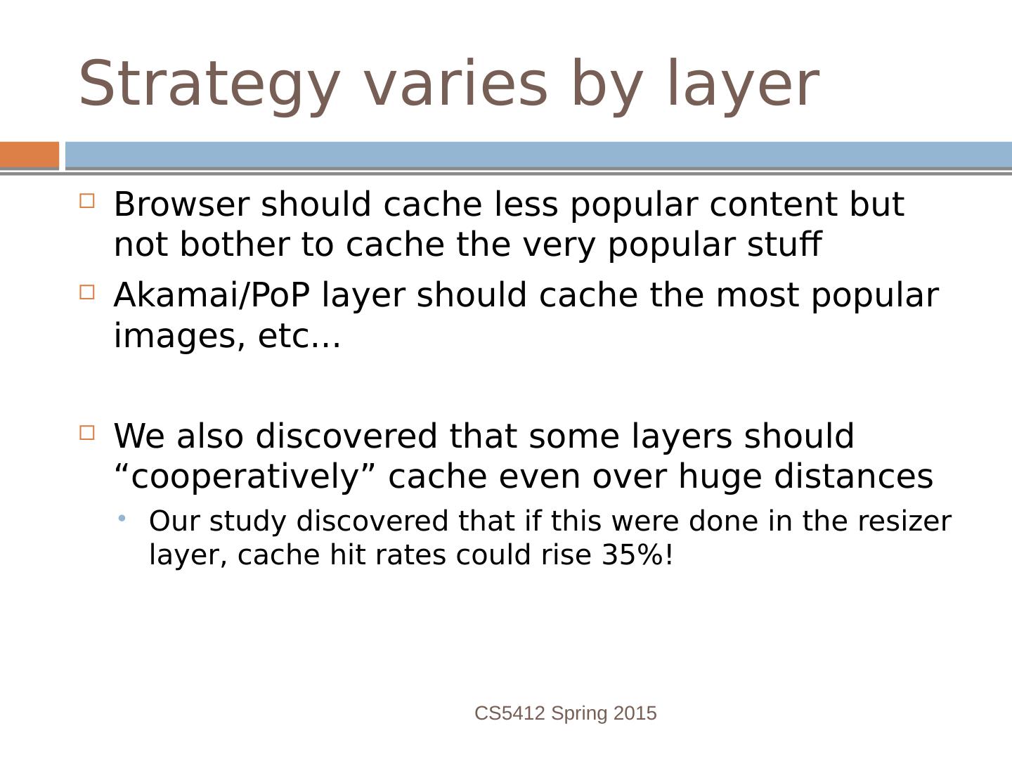 21 .Strategy varies by layer Browser should cache less popular content but not bother to cache the very popular stuff Akamai/PoP layer should cache the most popular images, etc... We also discovered that some layers should “cooperatively” cache even over huge distances Our study discovered that if this were done in the resizer layer, cache hit rates could rise 35%! CS5412 Spring 2015