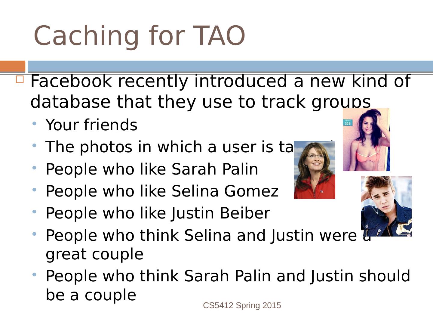 23 .Caching for TAO Facebook recently introduced a new kind of database that they use to track groups Your friends The photos in which a user is tagged People who like Sarah Palin People who like Selina Gomez People who like Justin Beiber People who think Selina and Justin were a great couple People who think Sarah Palin and Justin should be a couple CS5412 Spring 2015