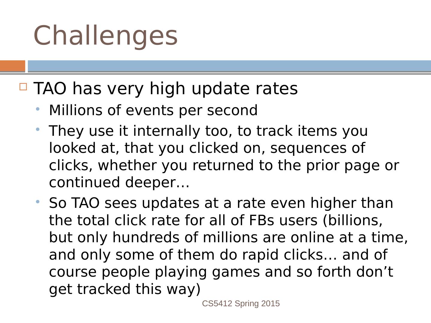 26 .Challenges TAO has very high update rates Millions of events per second They use it internally too, to track items you looked at, that you clicked on, sequences of clicks, whether you returned to the prior page or continued deeper… So TAO sees updates at a rate even higher than the total click rate for all of FBs users (billions, but only hundreds of millions are online at a time, and only some of them do rapid clicks… and of course people playing games and so forth don’t get tracked this way) CS5412 Spring 2015