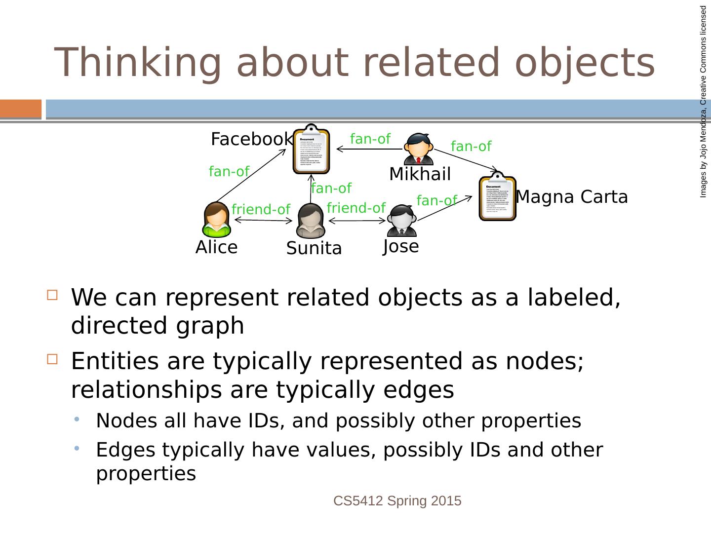 28 .Thinking about related objects We can represent related objects as a labeled, directed graph Entities are typically represented as nodes; relationships are typically edges Nodes all have IDs, and possibly other properties Edges typically have values, possibly IDs and other properties CS5412 Spring 2015 fan-of friend-of friend-of fan-of fan-of fan-of fan-of Alice Sunita Jose Mikhail Magna Carta Facebook Images by Jojo Mendoza, Creative Commons licensed
