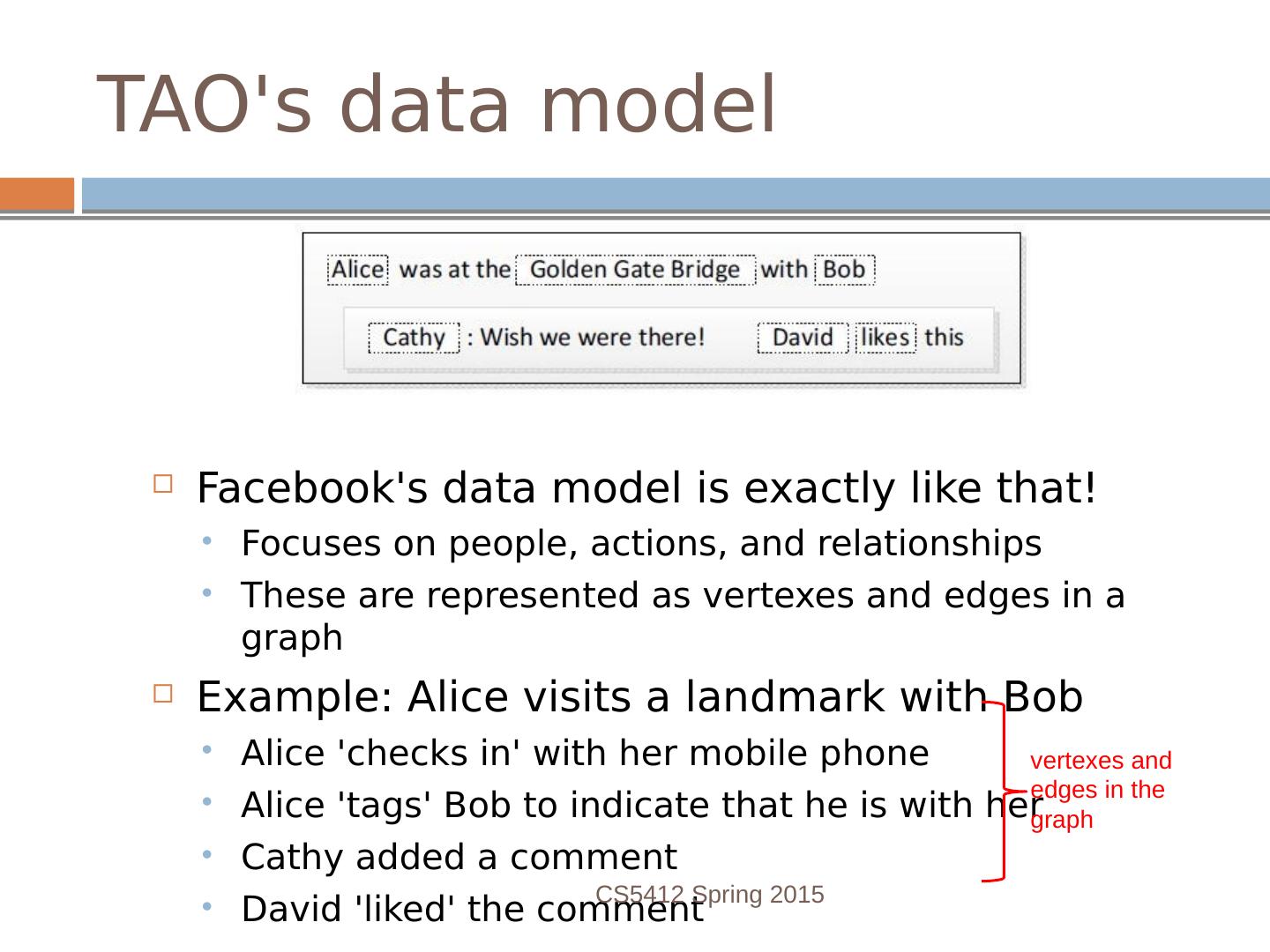 29 .TAOs data model Facebooks data model is exactly like that! Focuses on people, actions, and relationships These are represented as vertexes and edges in a graph Example: Alice visits a landmark with Bob Alice checks in with her mobile phone Alice tags Bob to indicate that he is with her Cathy added a comment David liked the comment CS5412 Spring 2015 vertexes and edges in the graph