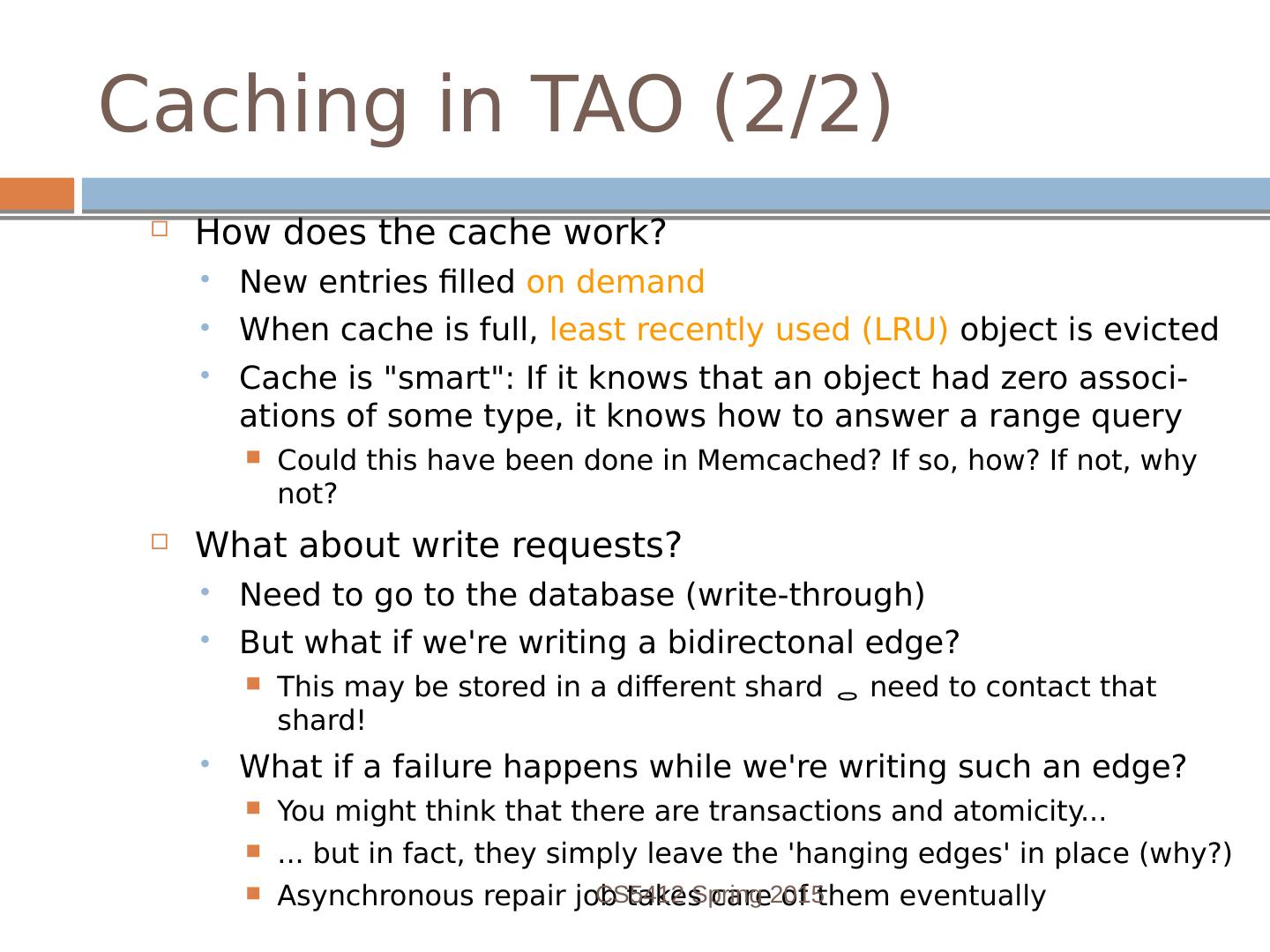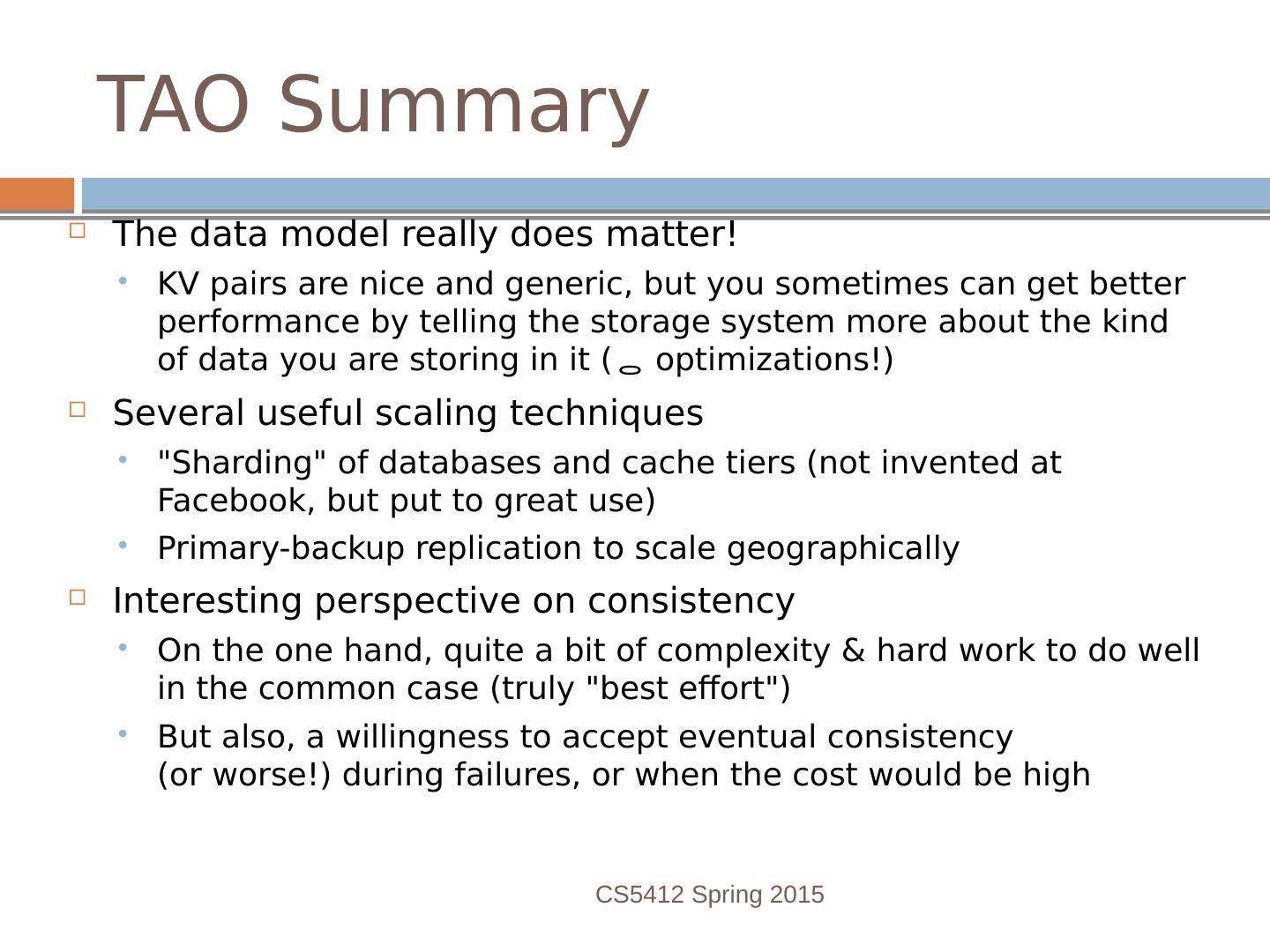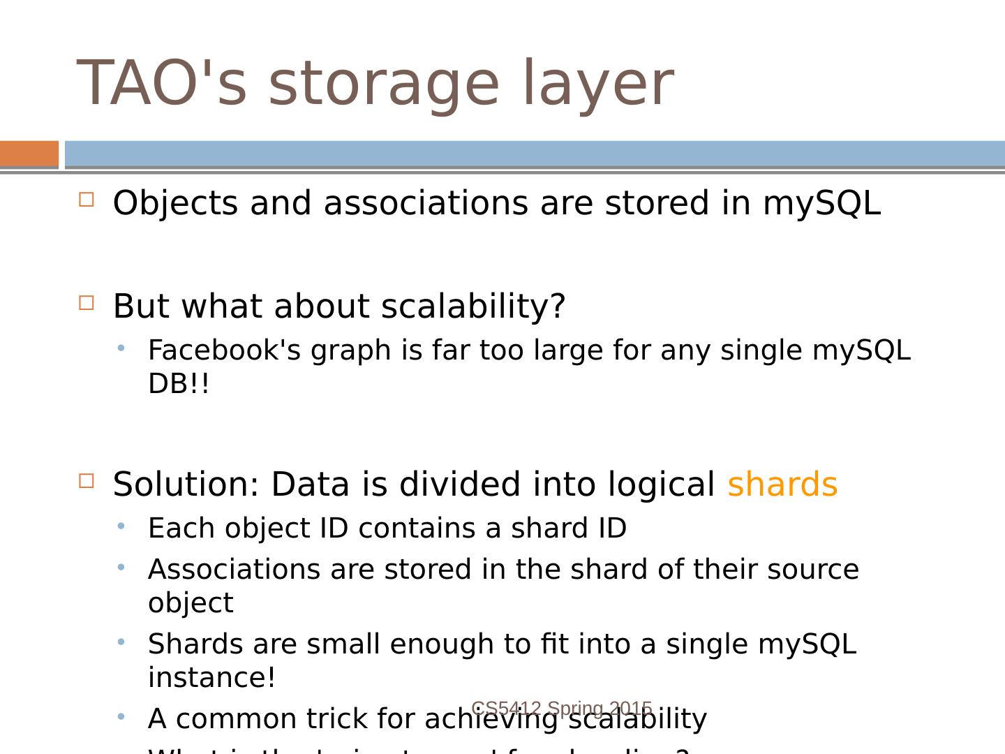 24 .How is TAO used? All sorts of FB operations require the system to Pull up some form of data Then search TAO for a group of things somehow related to that data Then pull up fingernails from that group of things, etc So TAO works hard, and needs to deal with all sorts of heavy loads Can one cache TAO data? Actually an open question CS5412 Spring 2015