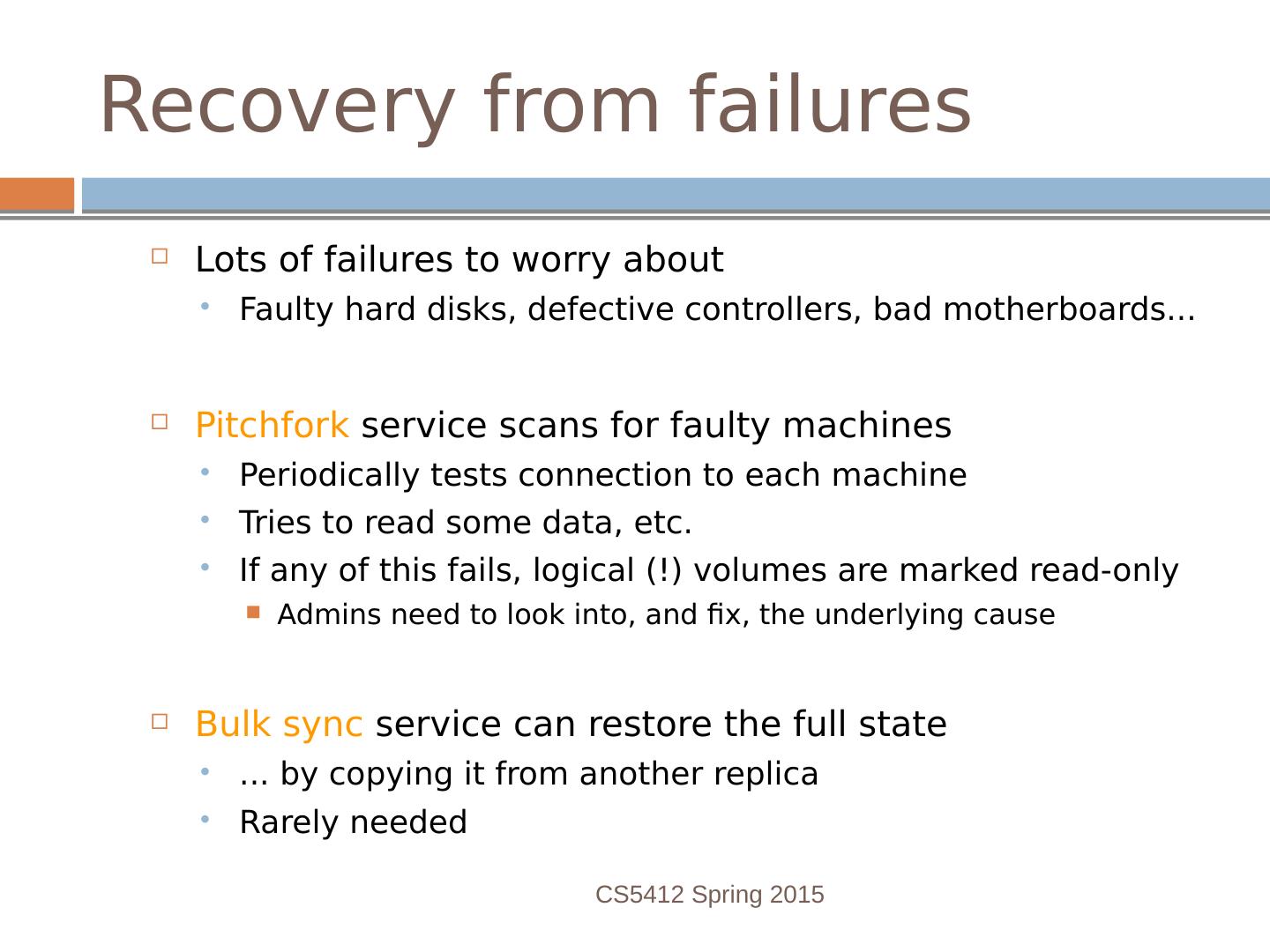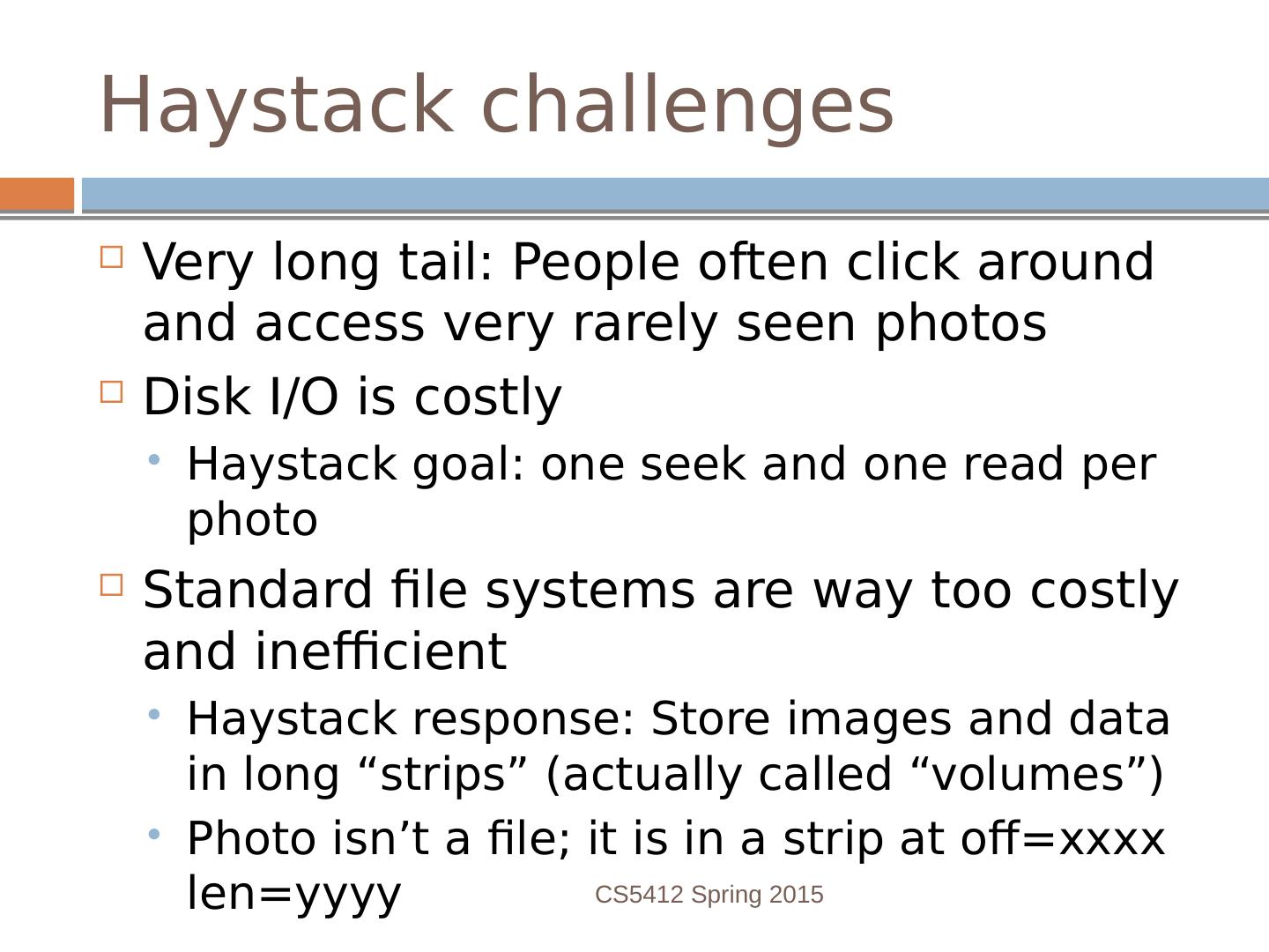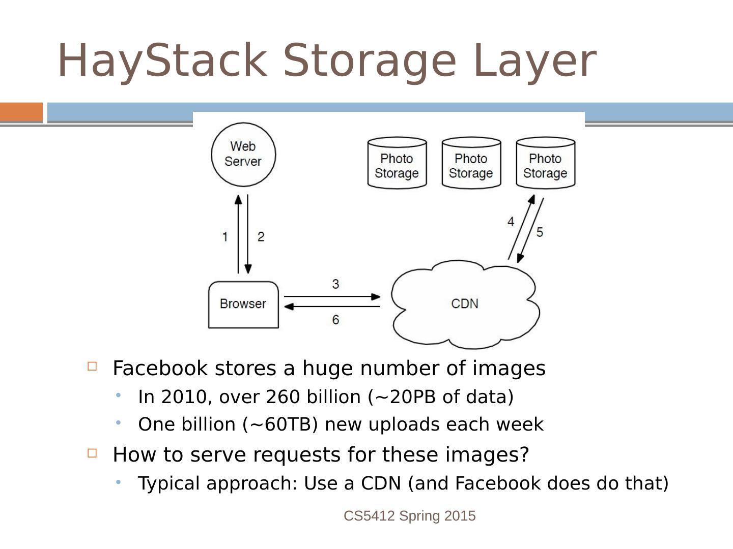 4 .Facebook “architecture” Think of Facebook as a giant distributed HashMap Key: photo URL (id, size, hints about where to find it...) Value: the blob itself CS5412 Spring 2015