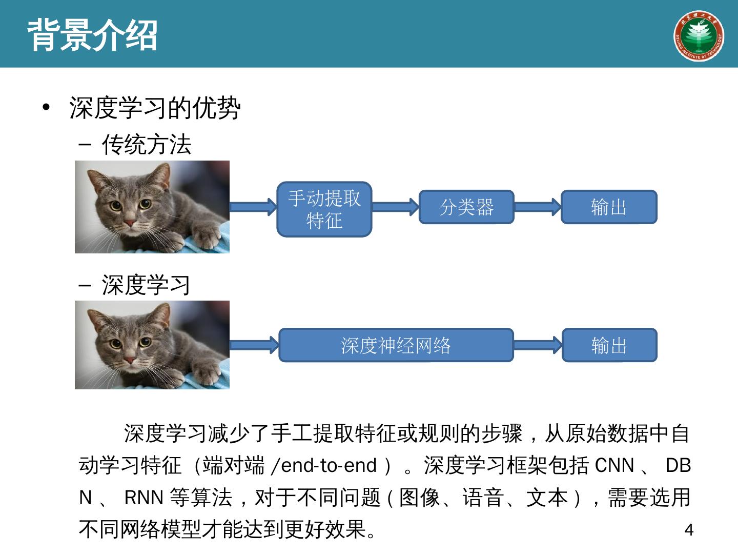4 .背景介绍 深度学习的优势 传统方法 深度学习 深度学习减少了手工提取特征或规则的步骤,从原始数据中自动学习特征(端对端 /end-to-end )。深度学习框架包括 CNN 、 DBN 、 RNN 等算法, 对于不同问题 ( 图像 、 语音 、 文本 ) ,需要选用不同网络模型才能达到更好效果。 4 手动提取特征 输出 分类器 深度神经网络 输出