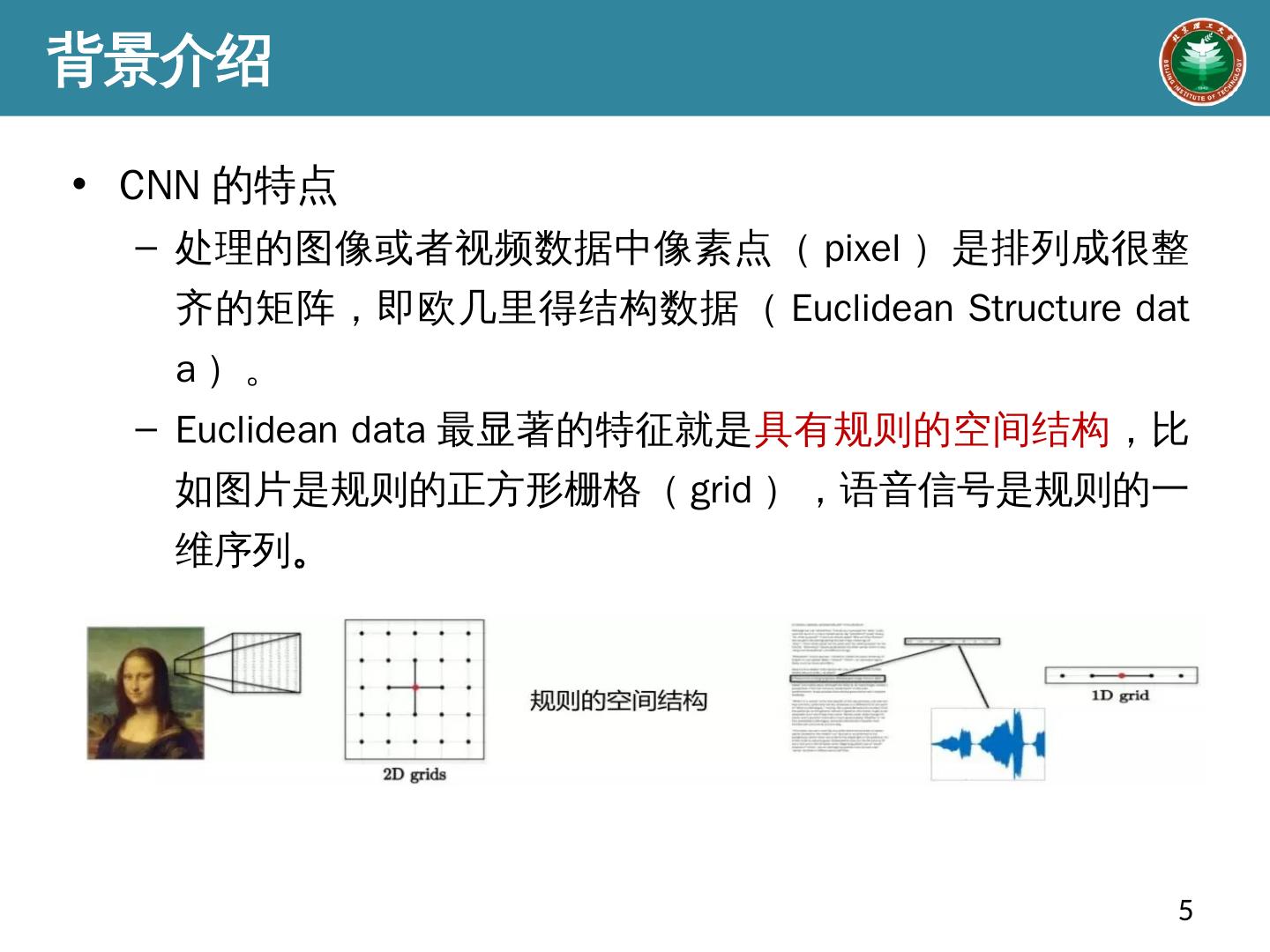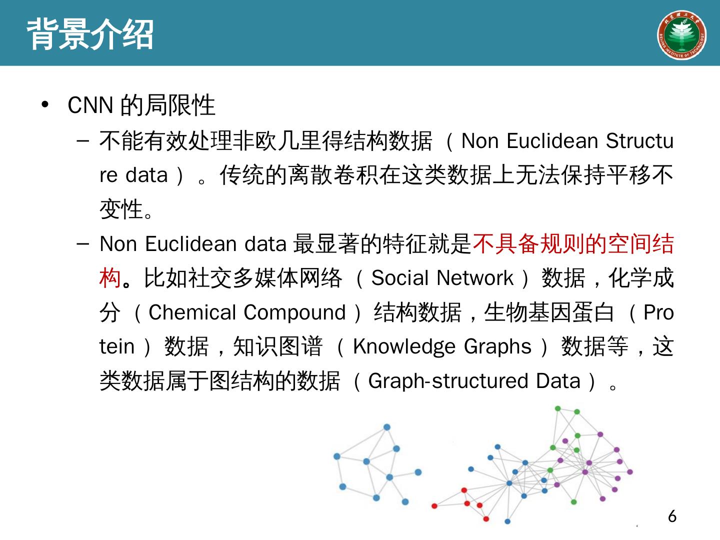 5 .背景介绍 CNN 的特点 处理 的图像或者视频数据中像素点( pixel )是排列 成很 整齐的 矩阵,即欧几里得结构数据( Euclidean Structure data )。 Euclidean data 最显著的特征 就是 具 有 规则的空间结构 ,比如图片是规则的正方形栅 格 ( grid ) , 语音信号 是 规则的一维序列 。 5
