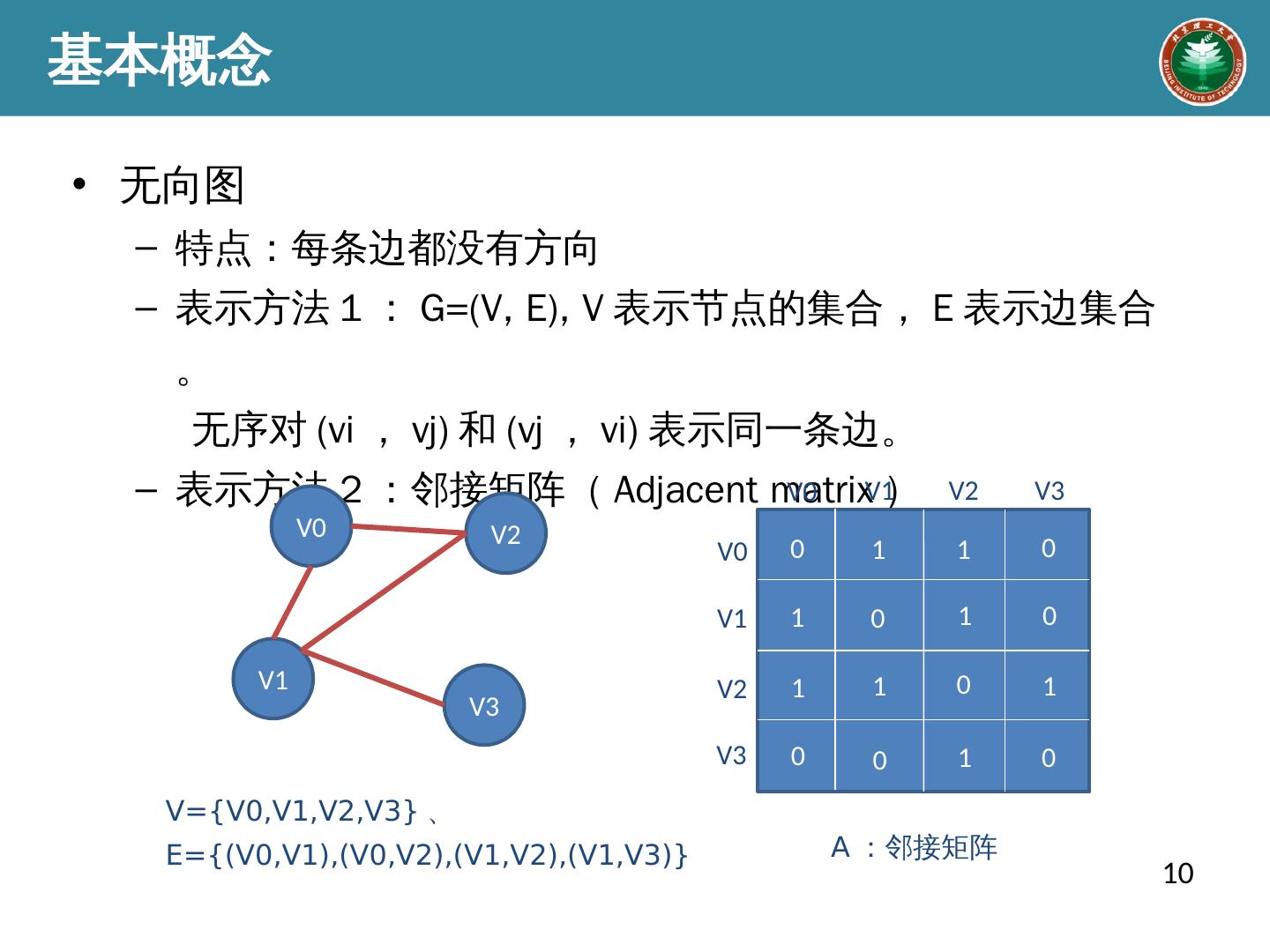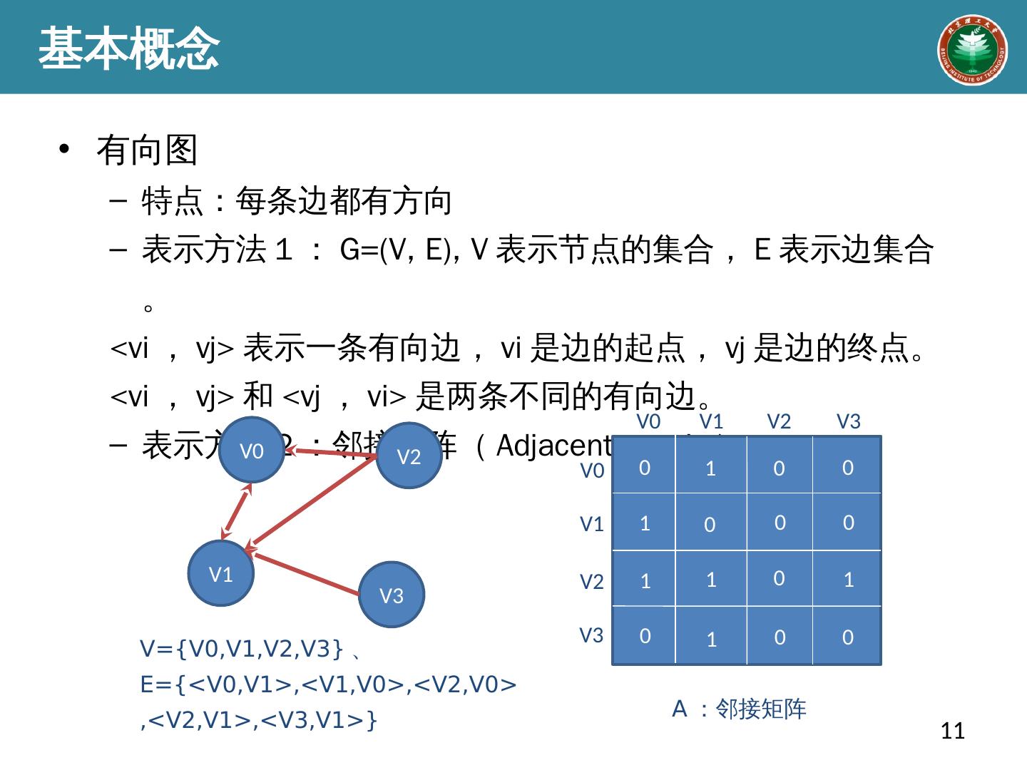 10 .基本概念 无向图 特点:每条边都没有方向 表示方法 1 : G =(V, E), V 表示节点的集合, E 表示边 集合。 无序 对 (vi , vj) 和 (vj , vi) 表示同一条边。 表示 方法 2 :邻接矩阵( Adjacent matrix ) 10 V={V0,V1,V2,V3} 、 E={(V0,V1),(V0,V2),(V1,V2),(V1,V3)} V0 V1 V3 V2 V0 V1 V0 V2 V1 V3 V3 V2 0 1 1 0 1 0 0 1 0 1 1 0 1 0 1 0 A :邻接矩阵