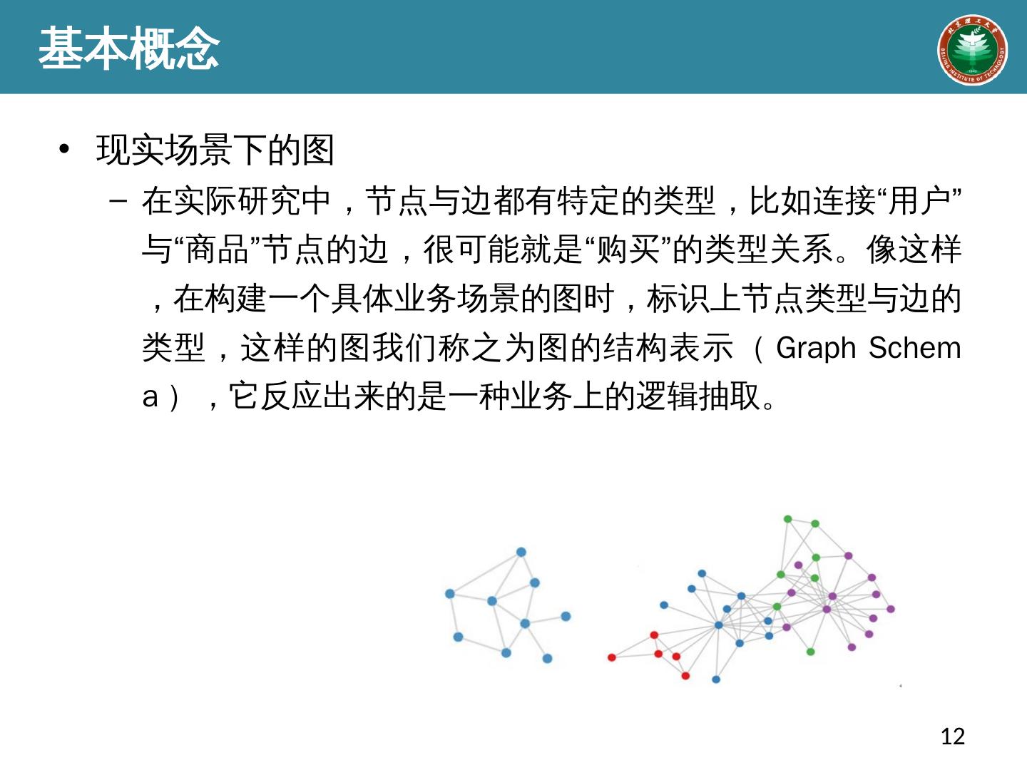 12 .基本概念 现实场景下的图 在实际研究中,节点与边都有特定的类型,比如连接“用户”与“商品”节点的边,很可能就是“购买”的类型关系。像这样,在构建一个具体业务场景的图时,标识上节点类型与边的类型,这样的图我们称之为图的结构表示( Graph Schema ),它反应出来的是一种业务上的逻辑抽取。 12