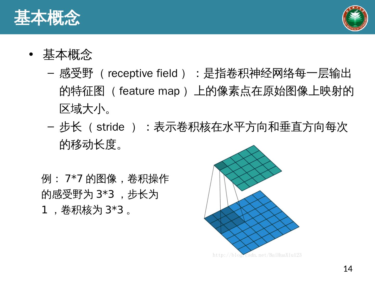 14 .基本概念 基本概念 感受野 ( receptive field ):是 指卷积神经网络每一层输出的特征图( feature map )上的像素点在原始图像上映射的区域大小。 步长( stride ):表示卷积核在水平方向 和垂直方向每次 的 移动 长度。 14 例 : 7*7 的 图像,卷积操作的感受野为 3*3 ,步长 为 1 ,卷积核为 3*3 。