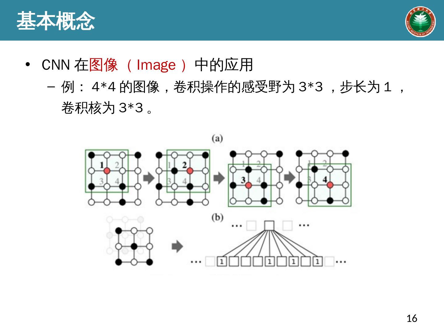 15 .基本概念 CNN 在 图像( Image ) 中的应用 CNN 中的卷积本质上就是利用一个共享参数的过滤器( kernel ),通过计算中心像素点以及相邻像素点的加权和来 构成特征图( feature map )实现 空间特征的 提取。 15