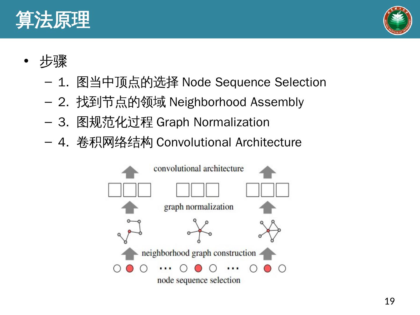 18 .算法原理 PATCHY-SAN (Select-Assemble-Normalize ) 思路 1 . 选出合适 的 节点 ; 2 . 为每一 个 节点 建立 一个邻域 ; 3. 建立 图 表示到 向量 表示的单一映射,保证具有相似的结构特征的 节点 可以被映射到 向量 当中相近的位置。 18 总体 上讲,就是用 w 个 固定大小( size=k )的 子图来表示输入 的图,再 将这 w 个 子图规范化后,生成 一个 w*k 维 的向量,作为 传统 CNN 的输入进行 学习。其实就是做了一个 从图到 向量的映射的一个预处理过程 。 其中 的图结构即可以是有向图,也可以是无向图。而且图的顶点或边的特征,可以同时有离散和连续的特征 。