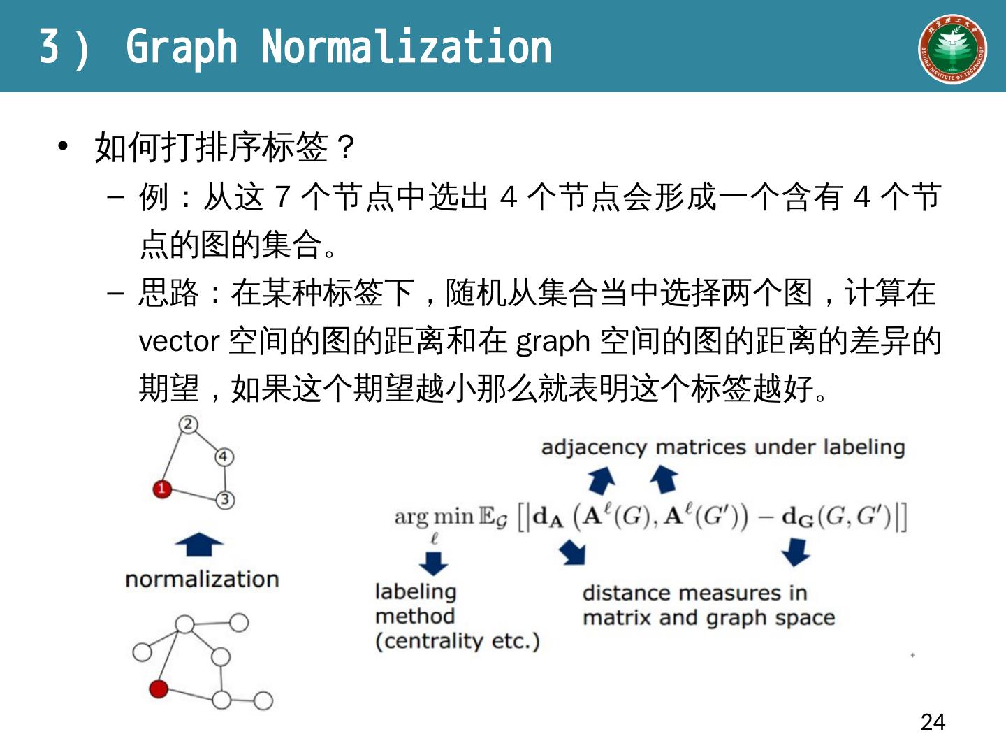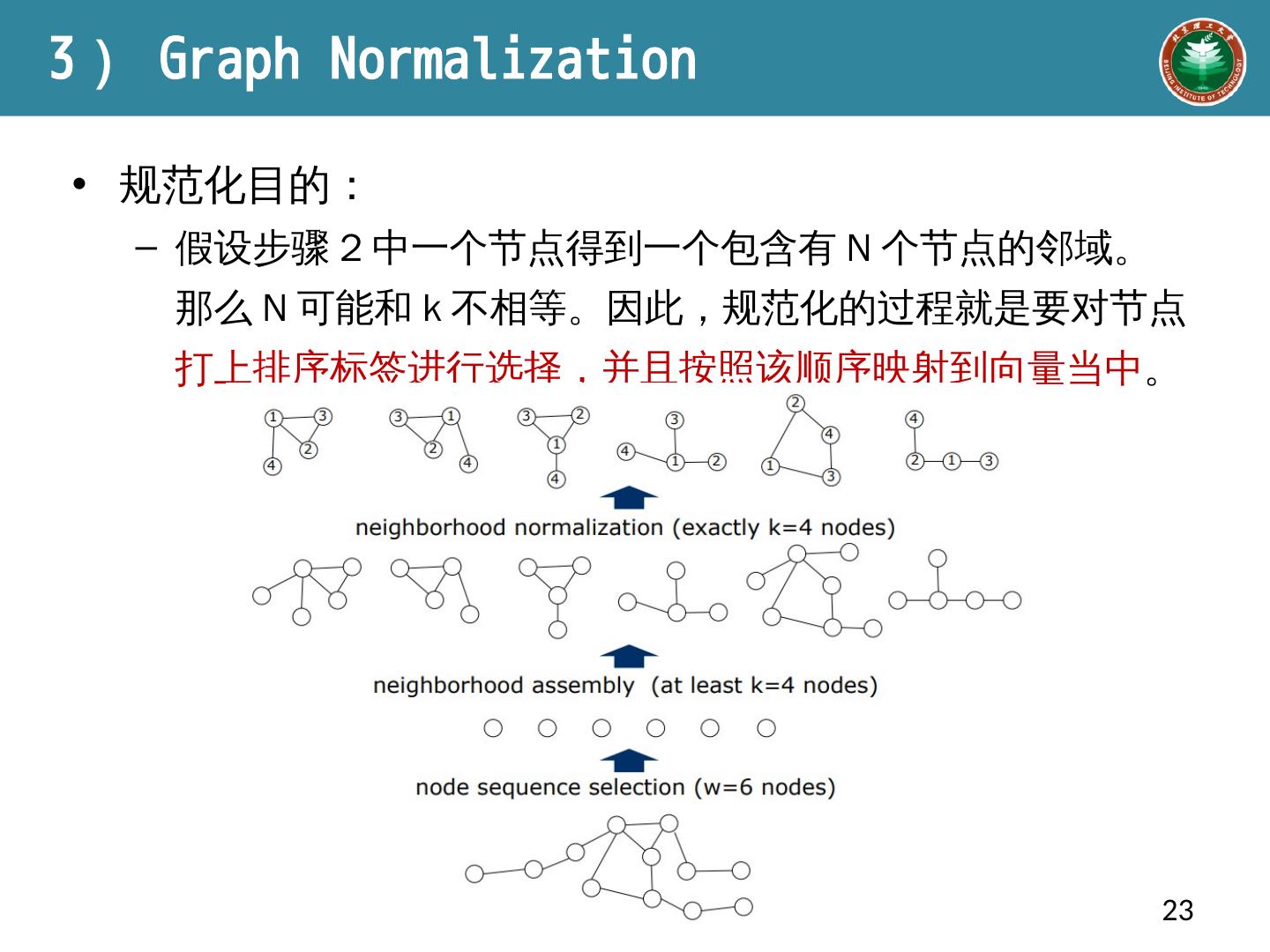 23 .3 ) Graph Normalization 规范化目的: 假设 步骤 2 中一个 节点 得到一个 包含有 N 个节点的邻 域。那么 N 可能和 k 不相等。因此, 规范化 的过程就是要对 节点 打上排序标签进行选择,并且按照该顺序映射到向量当中 。 23