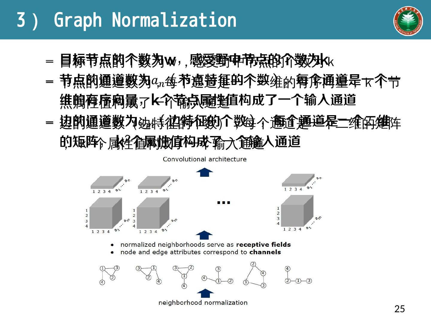25 .3 ) Graph Normalization 目标节点的个数为 w ,感受野中节点的个数为 k 节点 的通道数 为 , 每个通道是一个一维的有序 向量, k 个节点属性值构成了一个输入 通道 边的通道数 (边特征的 个数), 每个通道是一个二维的 矩阵, k 2 个属性值构成了一个输入通道 25