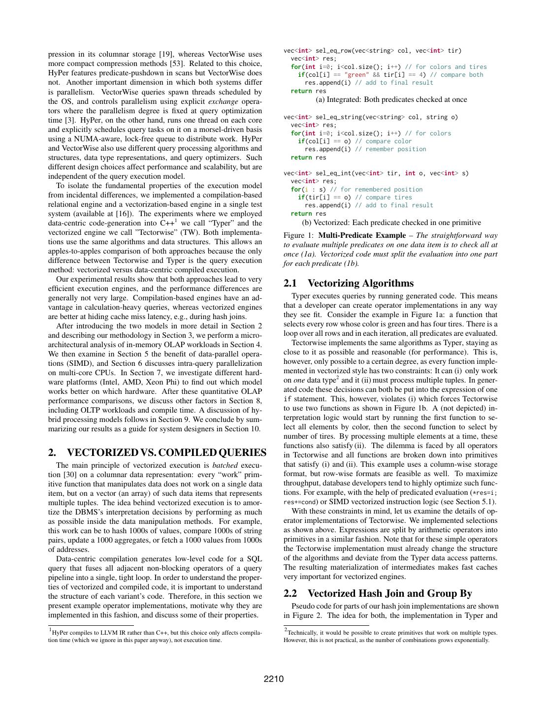 2 . vec<int> sel_eq_row(vec<string> col, vec<int> tir) pression in its columnar storage [19], whereas VectorWise uses vec<int> res; more compact compression methods [53]. Related to this choice, for(int i=0; i<col.size(); i++) // for colors and tires HyPer features predicate-pushdown in scans but VectorWise does if(col[i] == "green" && tir[i] == 4) // compare both not. Another important dimension in which both systems differ res.append(i) // add to final result is parallelism. VectorWise queries spawn threads scheduled by return res the OS, and controls parallelism using explicit exchange opera- (a) Integrated: Both predicates checked at once tors where the parallelism degree is fixed at query optimization time [3]. HyPer, on the other hand, runs one thread on each core vec<int> sel_eq_string(vec<string> col, string o) vec<int> res; and explicitly schedules query tasks on it on a morsel-driven basis for(int i=0; i<col.size(); i++) // for colors using a NUMA-aware, lock-free queue to distribute work. HyPer if(col[i] == o) // compare color and VectorWise also use different query processing algorithms and res.append(i) // remember position structures, data type representations, and query optimizers. Such return res different design choices affect performance and scalability, but are independent of the query execution model. vec<int> sel_eq_int(vec<int> tir, int o, vec<int> s) vec<int> res; To isolate the fundamental properties of the execution model for(i : s) // for remembered position from incidental differences, we implemented a compilation-based if(tir[i] == o) // compare tires relational engine and a vectorization-based engine in a single test res.append(i) // add to final result system (available at [16]). The experiments where we employed return res data-centric code-generation into C++1 we call “Typer” and the (b) Vectorized: Each predicate checked in one primitive vectorized engine we call ”Tectorwise” (TW). Both implementa- Figure 1: Multi-Predicate Example – The straightforward way tions use the same algorithms and data structures. This allows an to evaluate multiple predicates on one data item is to check all at apples-to-apples comparison of both approaches because the only once (1a). Vectorized code must split the evaluation into one part difference between Tectorwise and Typer is the query execution for each predicate (1b). method: vectorized versus data-centric compiled execution. Our experimental results show that both approaches lead to very efficient execution engines, and the performance differences are 2.1 Vectorizing Algorithms generally not very large. Compilation-based engines have an ad- Typer executes queries by running generated code. This means vantage in calculation-heavy queries, whereas vectorized engines that a developer can create operator implementations in any way are better at hiding cache miss latency, e.g., during hash joins. they see fit. Consider the example in Figure 1a: a function that After introducing the two models in more detail in Section 2 selects every row whose color is green and has four tires. There is a and describing our methodology in Section 3, we perform a micro- loop over all rows and in each iteration, all predicates are evaluated. architectural analysis of in-memory OLAP workloads in Section 4. Tectorwise implements the same algorithms as Typer, staying as We then examine in Section 5 the benefit of data-parallel opera- close to it as possible and reasonable (for performance). This is, tions (SIMD), and Section 6 discusses intra-query parallelization however, only possible to a certain degree, as every function imple- on multi-core CPUs. In Section 7, we investigate different hard- mented in vectorized style has two constraints: It can (i) only work ware platforms (Intel, AMD, Xeon Phi) to find out which model on one data type2 and it (ii) must process multiple tuples. In gener- works better on which hardware. After these quantitative OLAP ated code these decisions can both be put into the expression of one performance comparisons, we discuss other factors in Section 8, if statement. This, however, violates (i) which forces Tectorwise including OLTP workloads and compile time. A discussion of hy- to use two functions as shown in Figure 1b. A (not depicted) in- brid processing models follows in Section 9. We conclude by sum- terpretation logic would start by running the first function to se- marizing our results as a guide for system designers in Section 10. lect all elements by color, then the second function to select by number of tires. By processing multiple elements at a time, these functions also satisfy (ii). The dilemma is faced by all operators 2. VECTORIZED VS. COMPILED QUERIES in Tectorwise and all functions are broken down into primitives The main principle of vectorized execution is batched execu- that satisfy (i) and (ii). This example uses a column-wise storage tion [30] on a columnar data representation: every “work” prim- format, but row-wise formats are feasible as well. To maximize itive function that manipulates data does not work on a single data throughput, database developers tend to highly optimize such func- item, but on a vector (an array) of such data items that represents tions. For example, with the help of predicated evaluation (*res=i; multiple tuples. The idea behind vectorized execution is to amor- res+=cond) or SIMD vectorized instruction logic (see Section 5.1). tize the DBMS’s interpretation decisions by performing as much With these constraints in mind, let us examine the details of op- as possible inside the data manipulation methods. For example, erator implementations of Tectorwise. We implemented selections this work can be to hash 1000s of values, compare 1000s of string as shown above. Expressions are split by arithmetic operators into pairs, update a 1000 aggregates, or fetch a 1000 values from 1000s primitives in a similar fashion. Note that for these simple operators of a