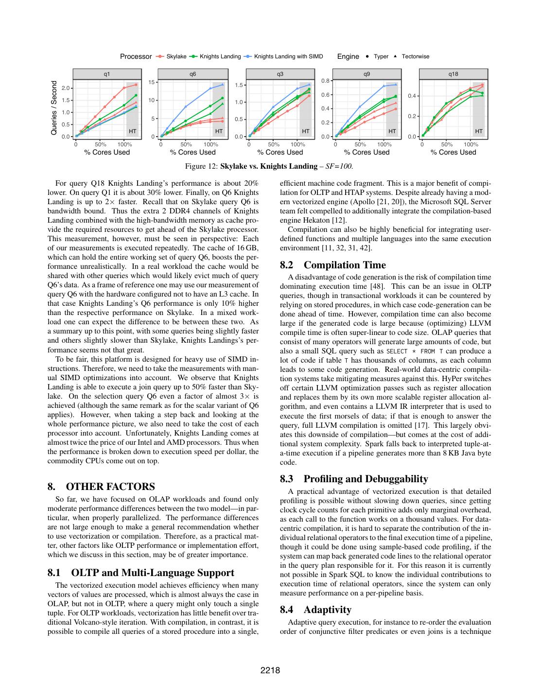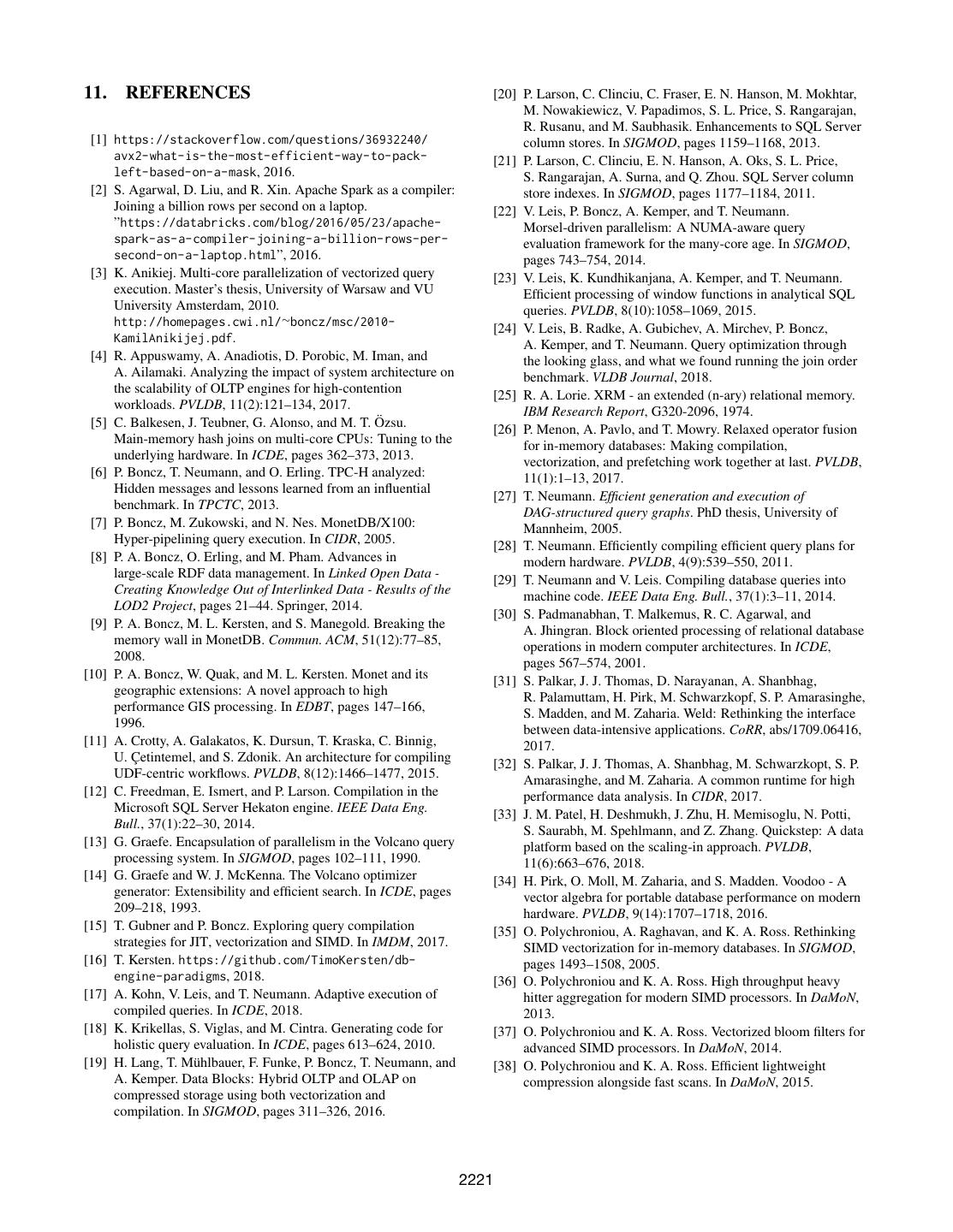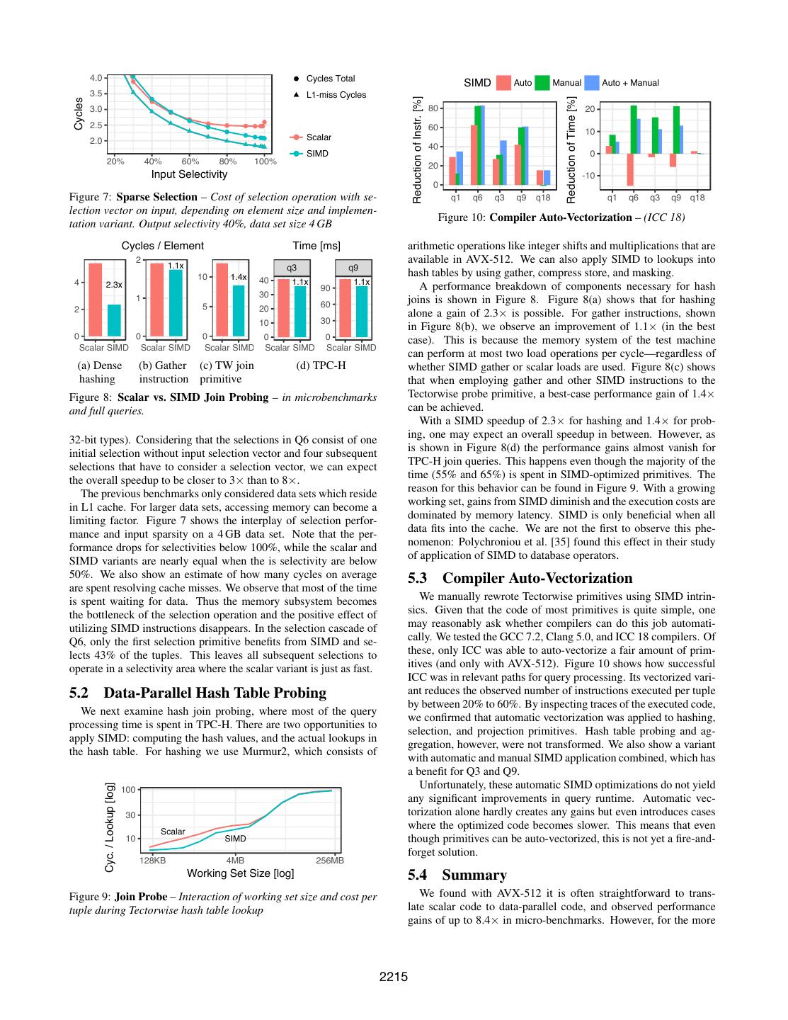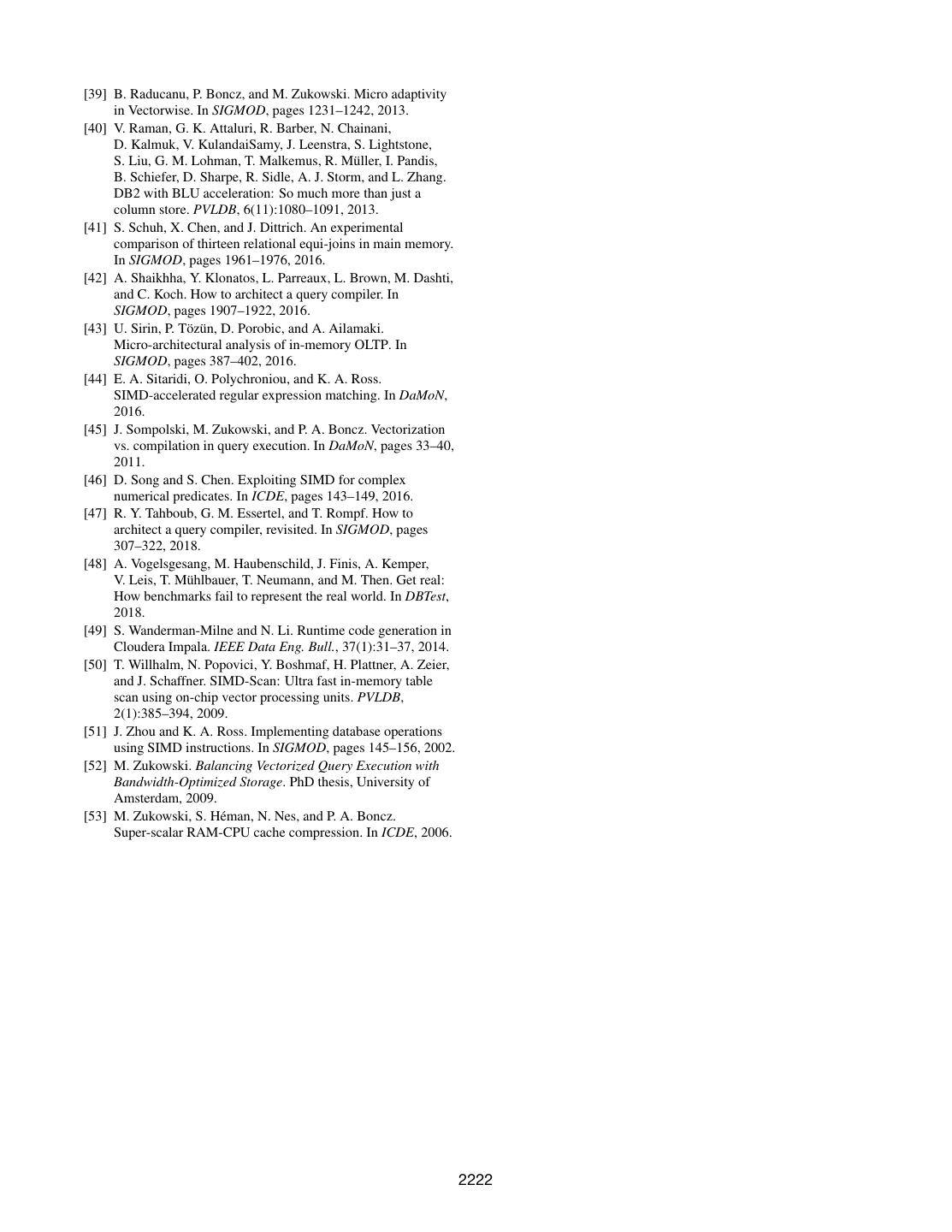 14 .[39] B. Raducanu, P. Boncz, and M. Zukowski. Micro adaptivity in Vectorwise. In SIGMOD, pages 1231–1242, 2013. [40] V. Raman, G. K. Attaluri, R. Barber, N. Chainani, D. Kalmuk, V. KulandaiSamy, J. Leenstra, S. Lightstone, S. Liu, G. M. Lohman, T. Malkemus, R. M¨uller, I. Pandis, B. Schiefer, D. Sharpe, R. Sidle, A. J. Storm, and L. Zhang. DB2 with BLU acceleration: So much more than just a column store. PVLDB, 6(11):1080–1091, 2013. [41] S. Schuh, X. Chen, and J. Dittrich. An experimental comparison of thirteen relational equi-joins in main memory. In SIGMOD, pages 1961–1976, 2016. [42] A. Shaikhha, Y. Klonatos, L. Parreaux, L. Brown, M. Dashti, and C. Koch. How to architect a query compiler. In SIGMOD, pages 1907–1922, 2016. [43] U. Sirin, P. T¨oz¨un, D. Porobic, and A. Ailamaki. Micro-architectural analysis of in-memory OLTP. In SIGMOD, pages 387–402, 2016. [44] E. A. Sitaridi, O. Polychroniou, and K. A. Ross. SIMD-accelerated regular expression matching. In DaMoN, 2016. [45] J. Sompolski, M. Zukowski, and P. A. Boncz. Vectorization vs. compilation in query execution. In DaMoN, pages 33–40, 2011. [46] D. Song and S. Chen. Exploiting SIMD for complex numerical predicates. In ICDE, pages 143–149, 2016. [47] R. Y. Tahboub, G. M. Essertel, and T. Rompf. How to architect a query compiler, revisited. In SIGMOD, pages 307–322, 2018. [48] A. Vogelsgesang, M. Haubenschild, J. Finis, A. Kemper, V. Leis, T. M¨uhlbauer, T. Neumann, and M. Then. Get real: How benchmarks fail to represent the real world. In DBTest, 2018. [49] S. Wanderman-Milne and N. Li. Runtime code generation in Cloudera Impala. IEEE Data Eng. Bull., 37(1):31–37, 2014. [50] T. Willhalm, N. Popovici, Y. Boshmaf, H. Plattner, A. Zeier, and J. Schaffner. SIMD-Scan: Ultra fast in-memory table scan using on-chip vector processing units. PVLDB, 2(1):385–394, 2009. [51] J. Zhou and K. A. Ross. Implementing database operations using SIMD instructions. In SIGMOD, pages 145–156, 2002. [52] M. Zukowski. Balancing Vectorized Query Execution with Bandwidth-Optimized Storage. PhD thesis, University of Amsterdam, 2009. [53] M. Zukowski, S. H´eman, N. Nes, and P. A. Boncz. Super-scalar RAM-CPU cache compression. In ICDE, 2006. 2222