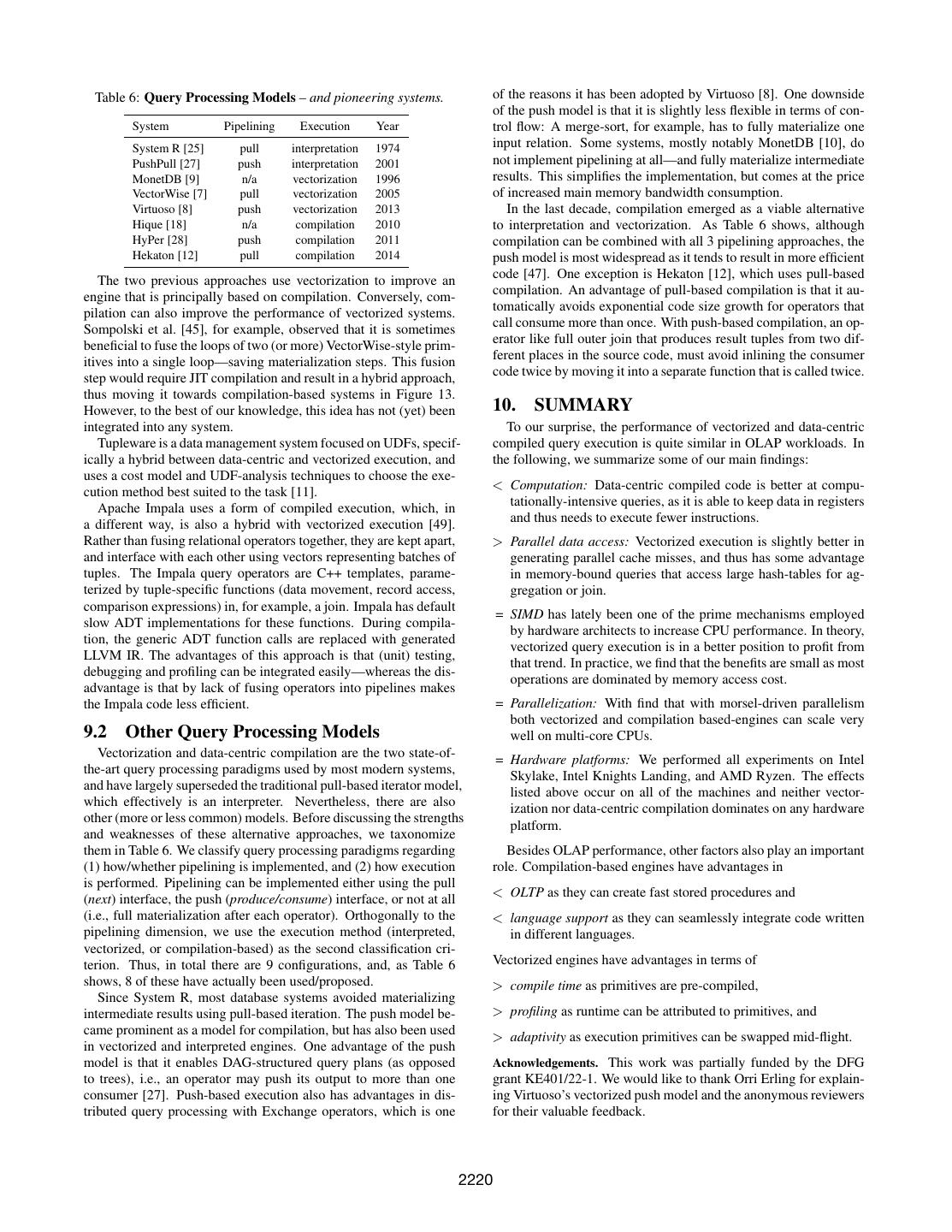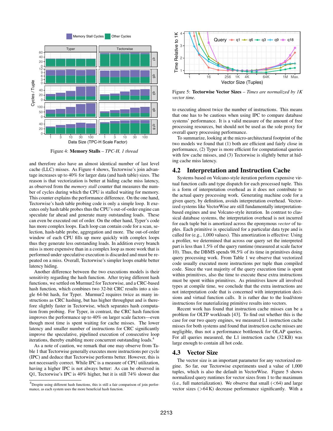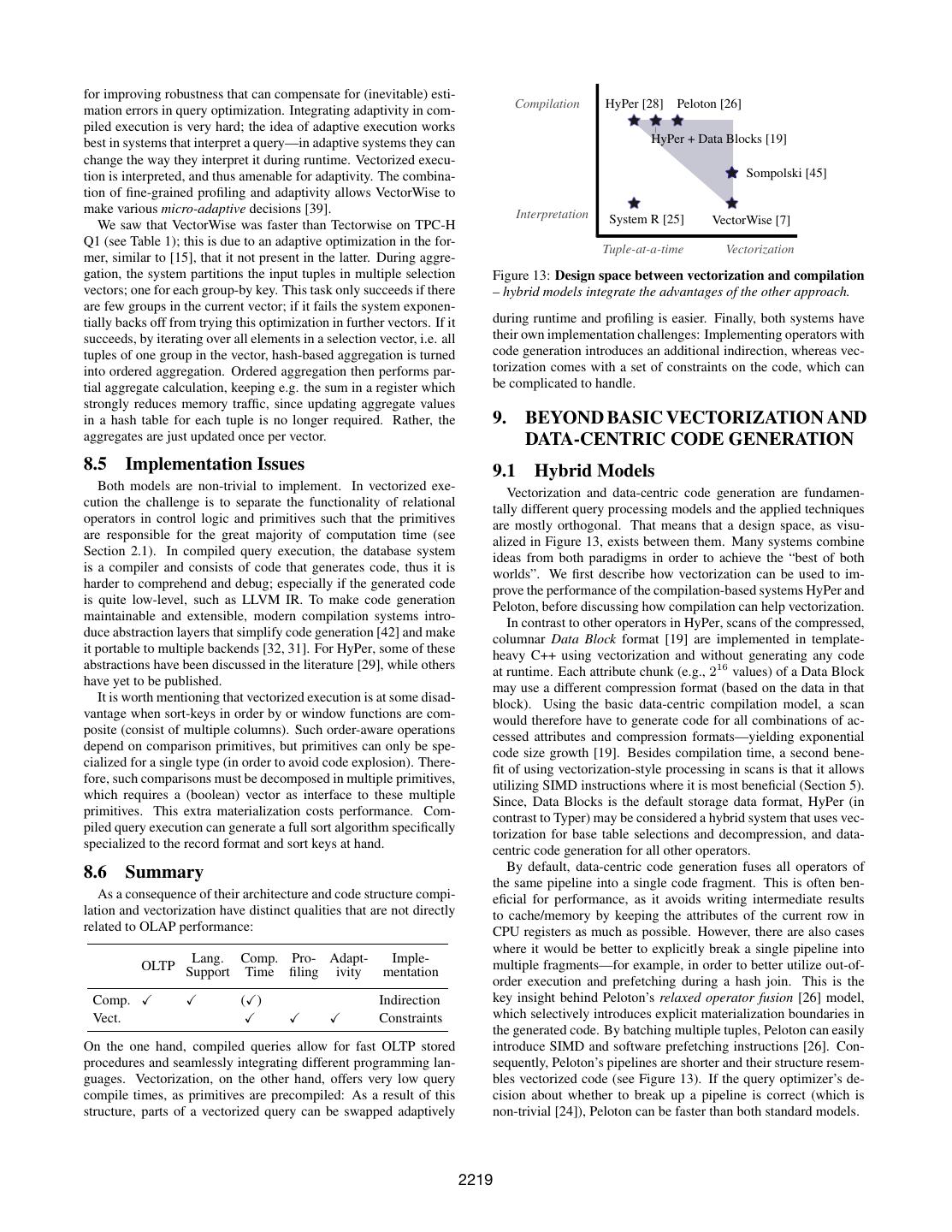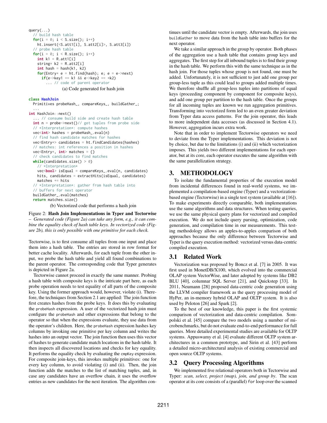 14 .[39] B. Raducanu, P. Boncz, and M. Zukowski. Micro adaptivity in Vectorwise. In SIGMOD, pages 1231–1242, 2013. [40] V. Raman, G. K. Attaluri, R. Barber, N. Chainani, D. Kalmuk, V. KulandaiSamy, J. Leenstra, S. Lightstone, S. Liu, G. M. Lohman, T. Malkemus, R. M¨uller, I. Pandis, B. Schiefer, D. Sharpe, R. Sidle, A. J. Storm, and L. Zhang. DB2 with BLU acceleration: So much more than just a column store. PVLDB, 6(11):1080–1091, 2013. [41] S. Schuh, X. Chen, and J. Dittrich. An experimental comparison of thirteen relational equi-joins in main memory. In SIGMOD, pages 1961–1976, 2016. [42] A. Shaikhha, Y. Klonatos, L. Parreaux, L. Brown, M. Dashti, and C. Koch. How to architect a query compiler. In SIGMOD, pages 1907–1922, 2016. [43] U. Sirin, P. T¨oz¨un, D. Porobic, and A. Ailamaki. Micro-architectural analysis of in-memory OLTP. In SIGMOD, pages 387–402, 2016. [44] E. A. Sitaridi, O. Polychroniou, and K. A. Ross. SIMD-accelerated regular expression matching. In DaMoN, 2016. [45] J. Sompolski, M. Zukowski, and P. A. Boncz. Vectorization vs. compilation in query execution. In DaMoN, pages 33–40, 2011. [46] D. Song and S. Chen. Exploiting SIMD for complex numerical predicates. In ICDE, pages 143–149, 2016. [47] R. Y. Tahboub, G. M. Essertel, and T. Rompf. How to architect a query compiler, revisited. In SIGMOD, pages 307–322, 2018. [48] A. Vogelsgesang, M. Haubenschild, J. Finis, A. Kemper, V. Leis, T. M¨uhlbauer, T. Neumann, and M. Then. Get real: How benchmarks fail to represent the real world. In DBTest, 2018. [49] S. Wanderman-Milne and N. Li. Runtime code generation in Cloudera Impala. IEEE Data Eng. Bull., 37(1):31–37, 2014. [50] T. Willhalm, N. Popovici, Y. Boshmaf, H. Plattner, A. Zeier, and J. Schaffner. SIMD-Scan: Ultra fast in-memory table scan using on-chip vector processing units. PVLDB, 2(1):385–394, 2009. [51] J. Zhou and K. A. Ross. Implementing database operations using SIMD instructions. In SIGMOD, pages 145–156, 2002. [52] M. Zukowski. Balancing Vectorized Query Execution with Bandwidth-Optimized Storage. PhD thesis, University of Amsterdam, 2009. [53] M. Zukowski, S. H´eman, N. Nes, and P. A. Boncz. Super-scalar RAM-CPU cache compression. In ICDE, 2006. 2222