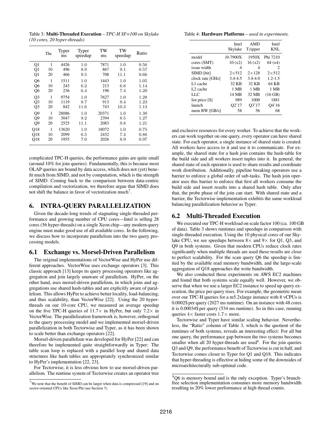 8 .Table 3: Multi-Threaded Execution – TPC-H SF=100 on Skylake Table 4: Hardware Platforms – used in experiments. (10 cores, 20 hyper-threads) Intel AMD Intel Typer Typer TW TW Skylake T.ripper KNL Thr. ms speedup ms speedup Ratio model i9-7900X 1950X Phi 7210 cores (SMT) 10 (x2) 16 (x2) 64 (x4) Q1 1 4426 1.0 7871 1.0 0.56 Q1 10 496 8.9 867 9.1 0.57 issue width 4 4 2 Q1 20 466 9.5 708 11.1 0.66 SIMD [bit] 2×512 2×128 2×512 clock rate [GHz] 3.4-4.5 3.4-4.0 1.2-1.5 Q6 1 1511 1.0 1443 1.0 1.05 Q6 10 243 6.2 213 6.8 1.14 L1 cache 32 KB 32 KB 64 KB Q6 20 236 6.4 196 7.4 1.20 L2 cache 1 MB 1 MB 1 MB LLC 14 MB 32 MB (16 GB) Q3 1 9754 1.0 7627 1.0 1.28 Q3 10 1119 8.7 913 8.4 1.23 list price [$] 989 1000 1881 Q3 20 842 11.6 743 10.3 1.13 launch Q2’17 Q3’17 Q4’16 mem BW [GB/s] 58 56 68 Q9 1 28086 1.0 20371 1.0 1.38 Q9 10 3047 9.2 2394 8.5 1.27 Q9 20 2525 11.1 2083 9.8 1.21 Q18 1 13620 1.0 18072 1.0 0.75 and exclusive resources for every worker. To achieve that the work- Q18 10 2099 6.5 2432 7.4 0.86 ers can work together on one query, every operator can have shared Q18 20 1955 7.0 2026 8.9 0.97 state. For each operator, a single instance of shared state is created. All workers have access to it and use it to communicate. For ex- ample, the shared state for a hash join contains the hash-table for complicated TPC-H queries, the performance gains are quite small the build side and all workers insert tuples into it. In general, the (around 10% for join queries). Fundamentally, this is because most shared state of each operator is used to share results and coordinate OLAP queries are bound by data access, which does not (yet) bene- work distribution. Additionally, pipeline breaking operators use a fit much from SIMD, and not by computation, which is the strength barrier to enforce a global order of sub-tasks. The hash join oper- of SIMD. Coming back to the comparison between data-centric ator uses this barrier to enforce that first all workers consume the compilation and vectorization, we therefore argue that SIMD does build side and insert results into a shared hash table. Only after not shift the balance in favor of vectorization much7 . that, the probe phase of the join can start. With shared state and a barrier, the Tectorwise implementation exhibits the same workload 6. INTRA-QUERY PARALLELIZATION balancing parallelization behavior as Typer. Given the decade-long trends of stagnating single-threaded per- formance and growing number of CPU cores—Intel is selling 28 6.2 Multi-Threaded Execution cores (56 hyper-threads) on a single Xeon chip—any modern query We executed our TPC-H workload on scale factor 100 (ca. 100 GB engine must make good use of all available cores. In the following, of data). Table 3 shows runtimes and speedups in comparison with we discuss how to incorporate parallelism into the two query pro- single-threaded execution. Using the 10 physical cores of our Sky- cessing models. lake CPU, we see speedups between 8× and 9× for Q1, Q3, and Q9 in both systems. Given that modern CPUs reduce clock rates 6.1 Exchange vs. Morsel-Driven Parallelism significantly when multiple threads are used these results are close The original implementations of VectorWise and HyPer use dif- to perfect scalability. For the scan query Q6 the speedup is lim- ferent approaches. VectorWise uses exchange operators [3]. This ited by the available read memory bandwidth, and the large-scale classic approach [13] keeps its query processing operators like ag- aggregation of Q18 approaches the write bandwidth. gregation and join largely unaware of parallelism. HyPer, on the We also conducted these experiments on AWS EC2 machines other hand, uses morsel-driven parallelism, in which joins and ag- and found that both systems scale equally well. However, we ob- gregations use shared hash-tables and are explicitly aware of paral- serve that when we use a larger EC2 instance to speed up query ex- lelism. This allows HyPer to achieve better locality, load-balancing, ecution, the price per query rises. For example, the geometric mean and thus scalability, than VectorWise [22]. Using the 20 hyper- over our TPC-H queries for a m5.2xlarge instance with 8 vCPUs is threads on our 10-core CPU, we measured an average speedup 0.0002$ per query (2027 ms runtime). On an instance with 48 cores on the five TPC-H queries of 11.7× in HyPer, but only 7.2× in it is 0.00034$ per query (534 ms runtime). So in this case, running VectorWise. The parallelization framework is, however, orthogonal queries 4× faster costs 1.7× more. to the query processing model and we implemented morsel-driven Tectorwise and Typer have similar scaling behavior. Neverthe- parallelization in both Tectorwise and Typer, as it has been shown less, the “Ratio” column of Table 3, which is the quotient of the to scale better than exchange operators [22]. runtimes of both systems, reveals an interesting effect: For all but Morsel-driven parallelism was developed for HyPer [22] and can one query, the performance gap between the two systems becomes therefore be implemented quite straightforwardly in Typer: The smaller when all 20 hyper-threads are used8 . For the join queries table scan loop is replaced with a parallel loop and shared data Q3 and Q9, the performance benefit of Tectorwise is cut in half, and structures like hash tables are appropriately synchronized similar Tectorwise comes closer to Typer for Q1 and Q18. This indicates to HyPer’s implementation [22, 23]. that hyper-threading is effective at hiding some of the downsides of For Tectorwise, it is less obvious how to use morsel-driven par- microarchitecturally sub-optimal code. allelism. The runtime system of Tectorwise creates an operator tree 8 Q6 is memory bound and is the only exception. Typer’s branch- 7 free selection implementation consumes more memory bandwidth We note that the benefit of SIMD can be larger when data is compressed [19] and on vector-oriented CPUs like Xeon