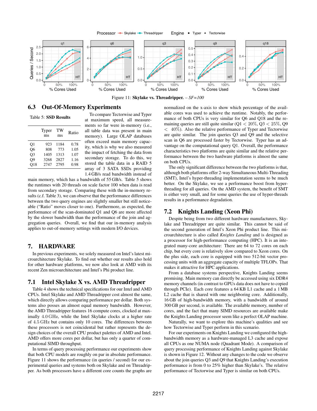 9 . Processor Skylake Threadripper Engine Typer Tectorwise q1 q6 q3 q9 q18 2.5 6 0.5 Queries / Second 2.0 0.4 1.0 0.4 4 1.5 0.3 1.0 0.2 0.2 2 0.5 0.5 0.1 HT HT HT HT HT 0.0 0 0.0 0.0 0.0 0 50% 100% 0 50% 100% 0 50% 100% 0 50% 100% 0 50% 100% % Cores Used % Cores Used % Cores Used % Cores Used % Cores Used Figure 11: Skylake vs. Threadripper. – SF=100 6.3 Out-Of-Memory Experiments normalized on the x-axis to show which percentage of the avail- To compare Tectorwise and Typer able cores was used to achieve the runtime. Notably, the perfor- Table 5: SSD Results mance of both CPUs is very similar for Q6 and Q18 and the re- at maximum speed, all measure- ments so far were in-memory (i.e., maining queries are still quite similar (Q1 < 20%, Q3 < 25%, Q9 Typer TW Ratio all table data was present in main < 40%). Also the relative performance of Typer and Tectorwise ms ms memory). Large OLAP databases are quite similar. The join queries Q3 and Q9 and the selective often exceed main memory capac- scan in Q6 are processed faster by Tectorwise. Typer has an ad- Q1 923 1184 0.78 vantage on the computational query Q1. Overall, the performance Q6 808 773 1.05 ity, which is why we also measured the impact of fetching the data from characteristics two platforms are quite similar and the relative per- Q3 1405 1313 1.07 secondary storage. To do this, we formance between the two hardware platforms is almost the same Q9 3268 2827 1.16 stored the table data in a RAID 5 on both CPUs. Q18 2747 2795 0.98 array of 3 SATA SSDs providing The only significant difference between the two platforms is that, 1.4 GB/s read bandwidth instead of although both platforms offer 2-way Simultaneous Multi-Threading main memory, which has a bandwidth of 55 GB/s. Table 5 shows (SMT), Intel’s hyper-threading implementation seems to be much the runtimes with 20 threads on scale factor 100 when data is read better. On the Skylake, we see a performance boost from hyper- from secondary storage. Comparing these with the in-memory re- threading for all queries. On the AMD system, the benefit of SMT sults (c.f. Table 3), we can observe that the performance differences is either very small, and for some queries the use of hyper-threads between the two query engines are slightly smaller but still notice- results in a performance degradation. able (“Ratio” moves closer to one). Furthermore, as expected, the performance of the scan-dominated Q1 and Q6 are more affected 7.2 Knights Landing (Xeon Phi) by the slower bandwidth than the performance of the join and ag- Despite being from two different hardware manufacturers, Sky- gregation queries. Overall, we find that our in-memory analysis lake and Threadripper are quite similar. This cannot be said of applies to out-of-memory settings with modern I/O devices. the second generation of Intel’s Xeon Phi product line. This mi- croarchitecture is also called Knights Landing and is designed as a processor for high-performance computing (HPC). It is an inte- 7. HARDWARE grated many-core architecture: There are 64 to 72 cores on each chip, but every core is relatively slow compared to Xeon cores. On In previous experiments, we solely measured on Intel’s latest mi- the plus side, each core is equipped with two 512-bit vector pro- croarchitecture Skylake. To find out whether our results also hold cessing units with an aggregate capacity of multiple TFLOPs. That for other hardware platforms, we now also look at AMD with its makes it attractive for HPC applications. recent Zen microarchitecture and Intel’s Phi product line. From a database systems perspective, Knights Landing seems promising. Main memory can directly be accessed using six DDR4 7.1 Intel Skylake X vs. AMD Threadripper memory channels (in contrast to GPUs data does not have to copied Table 4 shows the technical specifications for our Intel and AMD through PCIe). Each core features a 64 KB L1 cache and a 1 MB CPUs. Intel Skylake and AMD Threadripper cost almost the same, L2 cache that is shared with one neighboring core. Additionally, which directly allows comparing performance per dollar. Both sys- 16 GB of high-bandwidth memory, with a bandwidth of around tems also posses an almost equal memory bandwidth. However, 300 GB per second, is available. The available memory, number of the AMD Threadripper features 16 compute cores, clocked at max- cores, and the fact that many SIMD resources are available make imally 4.0 GHz, while the Intel Skylake clocks at a higher rate the Knights Landing processor seem like a perfect OLAP machine. of 4.5 GHz but contains only 10 cores. The differences between Naturally, we want to explore this machine’s qualities and see these processors is not coincidental but rather represents the de- how Tectorwise and Typer perform in this scenario. sign choices of the overall CPU product palettes of AMD and Intel. For our experiments on Knights Landing we configured the high- AMD offers more cores per dollar, but has only a quarter of com- bandwidth memory as a hardware-managed L3 cache and expose putational SIMD throughput. all CPUs as one NUMA node (Quadrant Mode). A comparison of In terms of query processing performance our experiments show query processing performance of Knights Landing against Skylake that both CPU models are roughly on par in absolute performance. is shown in Figure 12. Without any changes to the code we observe Figure 11 shows the performance (in queries / second) for our ex- about the join queries Q3 and Q9 that Knights Landing’s execution perimental queries and systems both on Skylake and on Threadrip- performance is from 0 to 25% higher than Skylake’s. The relative per. As both processors have a different core counts the graphs are performance of Tectorwise and Typer is similar on both CPUs. 2217