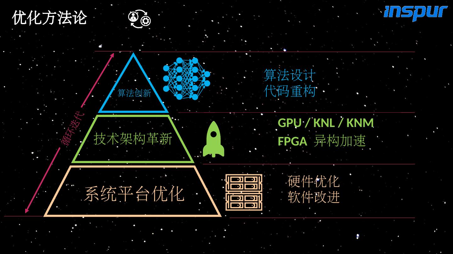 5 .优化方法论 硬件优化 软件改进 GPU / KNL / KNM FPGA 异构加速 算法设计 代码重构 算法创新 技术架构革新 系统 平台优化 循环迭代