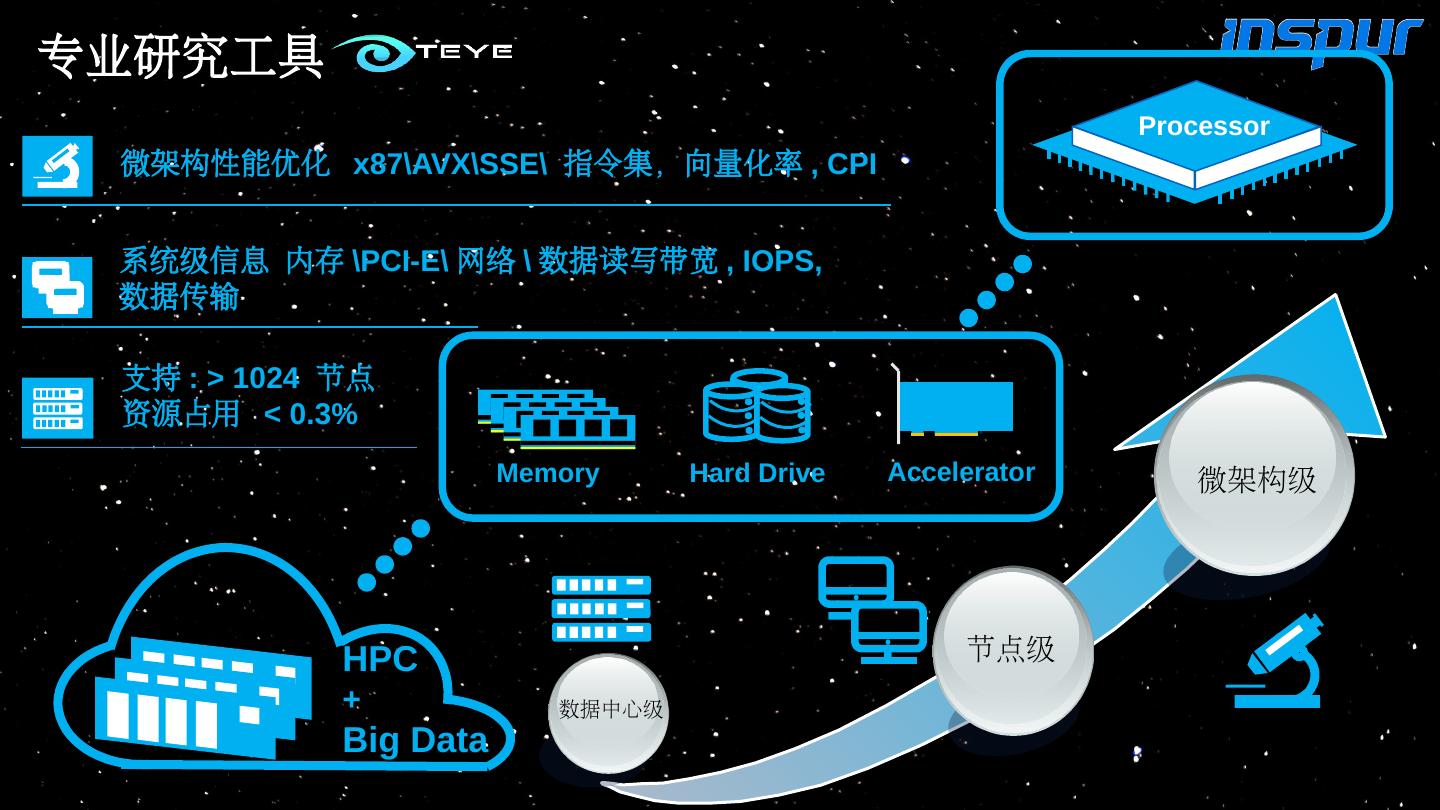 6 .HPC + Big Data Memory Hard Drive Accelerator 数据中心级 节点级 微架构级 支持 : > 1024 节点 资源占用 < 0.3% 系统级信息 内存 \PCI-E\ 网络 \ 数据读写带宽 , IOPS, 数据传输 微架构性能优化 x87\AVX\SSE \ 指令集,向量化率 , CPI Processor 专业研究工具