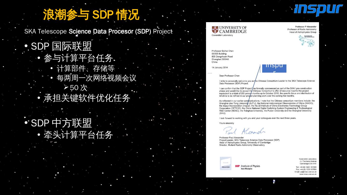 11 .浪潮参与 SDP 情况 SDP 国际联盟 参与计算平台任务 计算部件、存储等 每两周一次网络视频会议 50 次 承担关键软件优化任务 SDP 中方联盟 牵头计算平台任务 SKA Telescope Science Data Procesor (SDP) Project Inspur