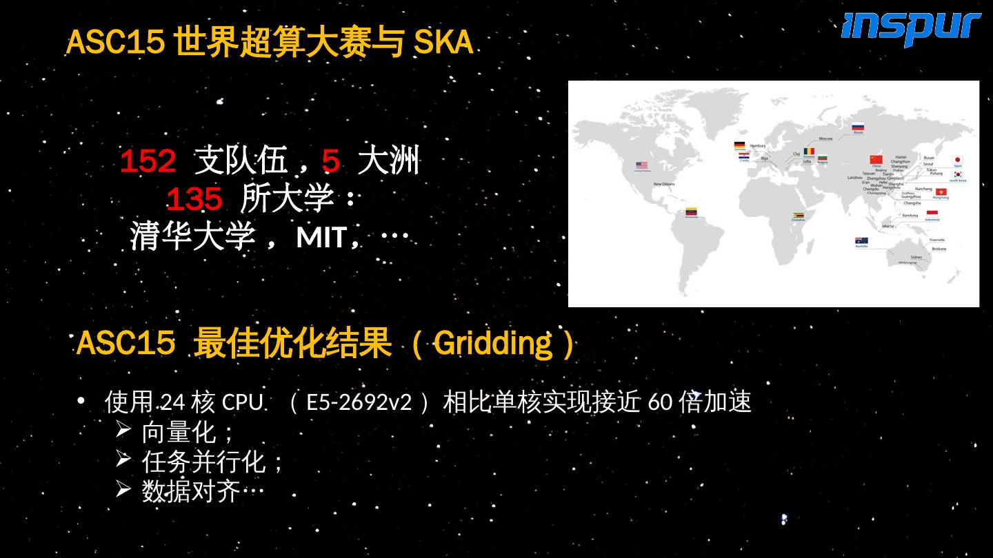 15 .152 支队伍 , 5 大洲 135 所大学 : 清华大学 , MIT , … ASC15 世界超算大赛与 SKA ASC15 最佳优化结果( Gridding ) 使用 24 核 CPU ( E5-2692v2 )相比单核实现接近 60 倍加速 向量化; 任务并行化; 数据对齐 …