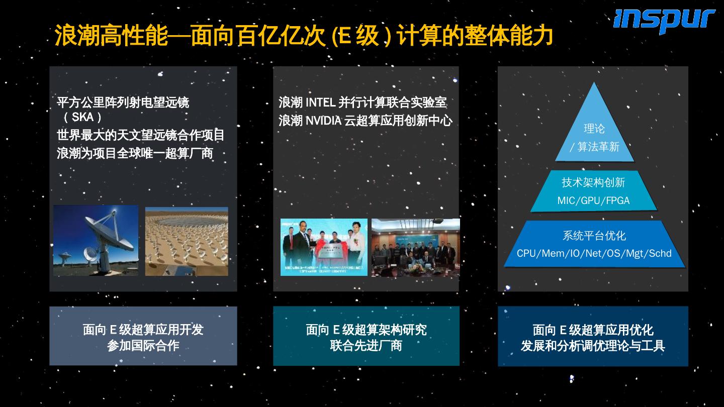 18 .浪潮高性能 — 面向百亿亿次 (E 级 ) 计算的整体能力 平方公里阵列射电望远镜( SKA ) 世界 最大 的天文望远镜合作项目 浪潮为项目全球唯一超算厂商 面向 E 级超算架构研究 联合先进厂商 浪潮 INTEL 并行计算 联合实验室 浪潮 NVIDIA 云超算应用创新中心 面向 E 级超算应用优化 发展和分析调优理论与工具 理论 / 算法革新 技术架构创新 MIC/GPU/FPGA 系统平台优化 CPU/Mem/IO/Net/OS/ Mgt / Schd 面向 E 级超算应用开发 参加国际合作