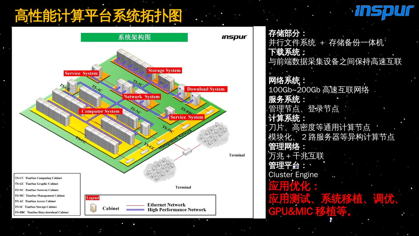 22 .高性能计算平台系统拓扑图 存储部分: 并行 文件系统 + 存储备份一体机 下载系统: 与前端数据采集设备之间保持高速互联。 网络 系统: 100Gb~200Gb 高速互联网络 服务系统: 管理节点、登录节点 计算系统: 刀片、高密度等通用计算节点 模块化、 2 路服务器等异构计算节点 管理 网络: 万兆 + 千兆互联 管理平台: Cluster Engine 应用优化: 应用测试、系统移植、调优、 GPU&MIC 移植等。