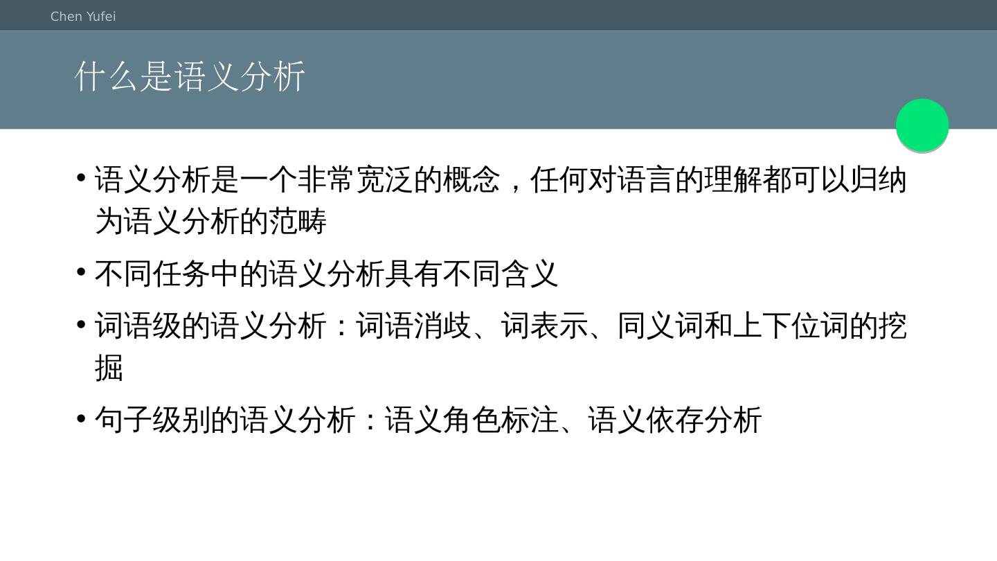 2 .什么是语义分析 语义分析是一个非常宽泛的概念,任何对语言的理解都可以归纳为语义分析的范畴 不同任务中的语义分析具有不同含义 词语级的语义分析:词语消歧、词表示、同义词和上下位词的挖掘 句子级别的语义分析:语义角色标注、语义依存分析