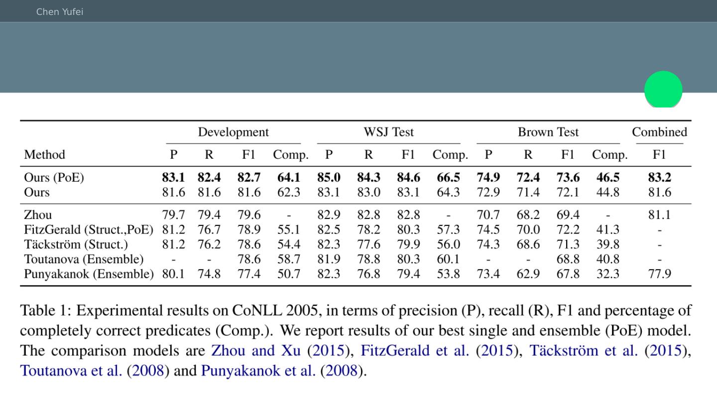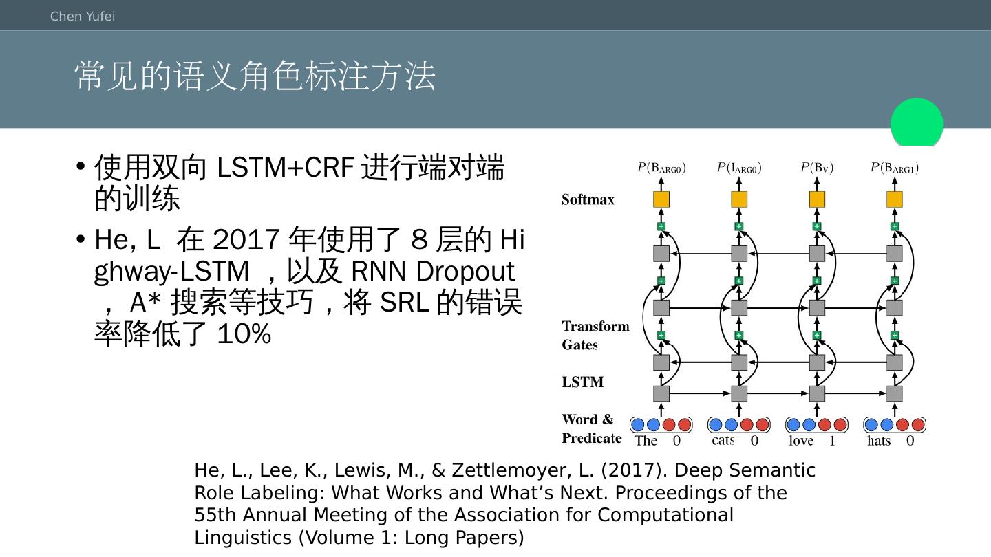 5 .常见的语义角色标注方法 使用双向LSTM+CRF进行端对端的训练 He, L 在2017年使用了8层的Highway-LSTM,以及RNN Dropout,A*搜索等技巧,将SRL的错误率降低了10% He, L., Lee, K., Lewis, M., & Zettlemoyer, L. (2017). Deep Semantic Role Labeling: What Works and What’s Next. Proceedings of the 55th Annual Meeting of the Association for Computational Linguistics (Volume 1: Long Papers)