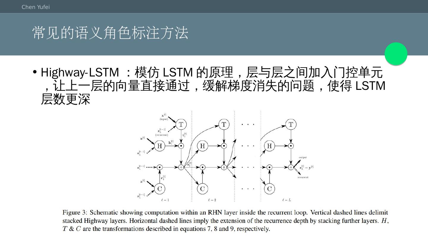 6 .常见的语义角色标注方法 Highway-LSTM:模仿LSTM的原理,层与层之间加入门控单元,让上一层的向量直接通过,缓解梯度消失的问题,使得LSTM层数更深