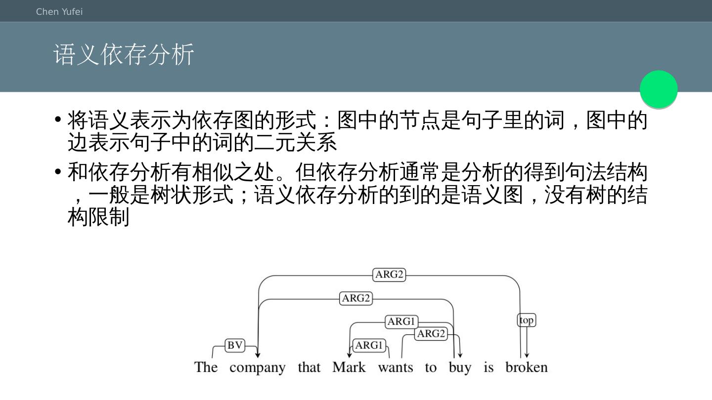 8 .语义依存分析 将语义表示为依存图的形式:图中的节点是句子里的词,图中的边表示句子中的词的二元关系 和依存分析有相似之处。但依存分析通常是分析的得到句法结构,一般是树状形式;语义依存分析的到的是语义图,没有树的结构限制