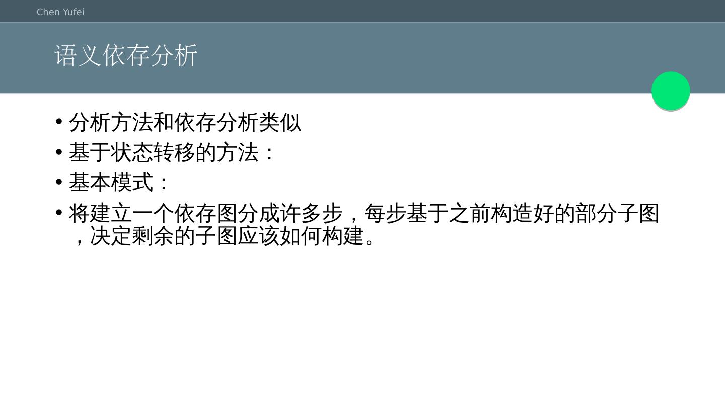 10 .语义依存分析 分析方法和依存分析类似 基于状态转移的方法: 基本模式: 将建立一个依存图分成许多步,每步基于之前构造好的部分子图,决定剩余的子图应该如何构建。