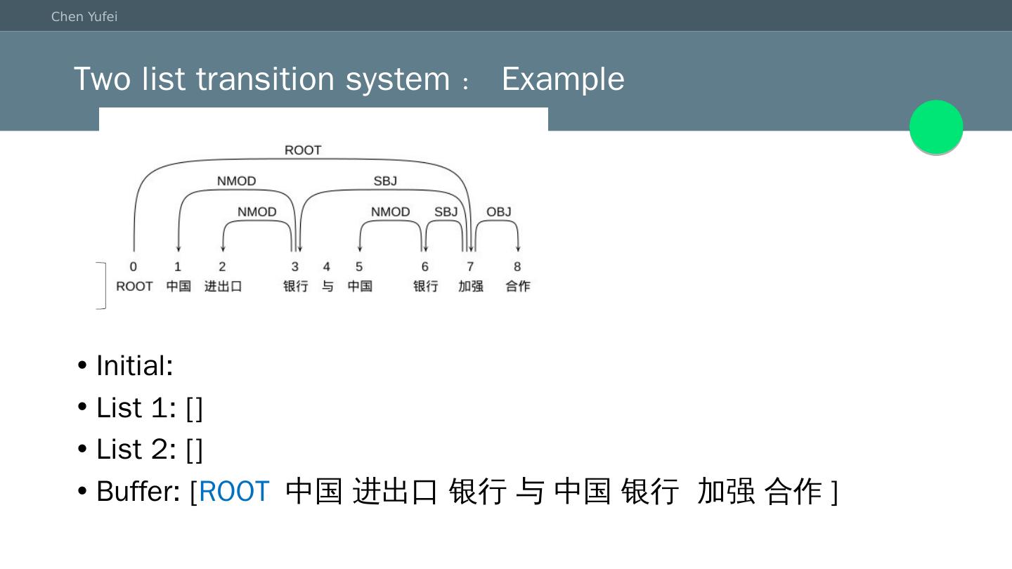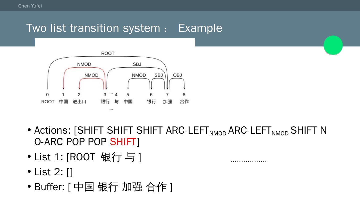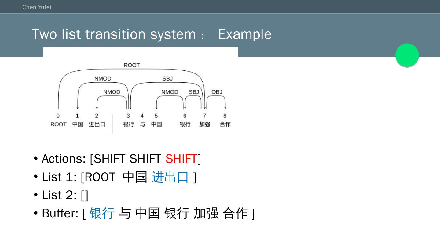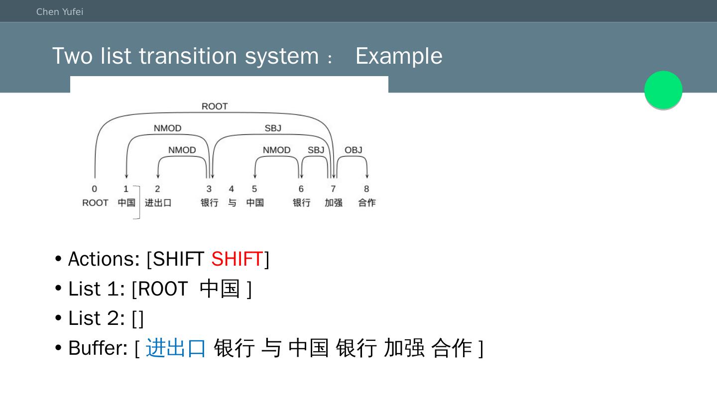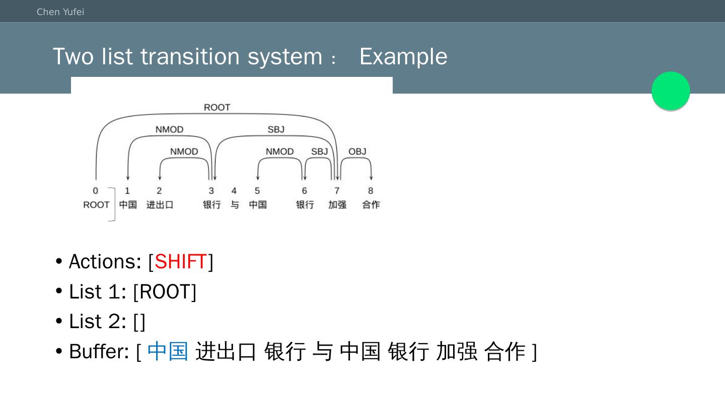 13 .Two list transition system:Example Actions: [SHIFT SHIFT ] List 1: [ROOT 中国 ] List 2: [] Buffer: [ 进出口 银行 与 中国 银行 加强 合作]