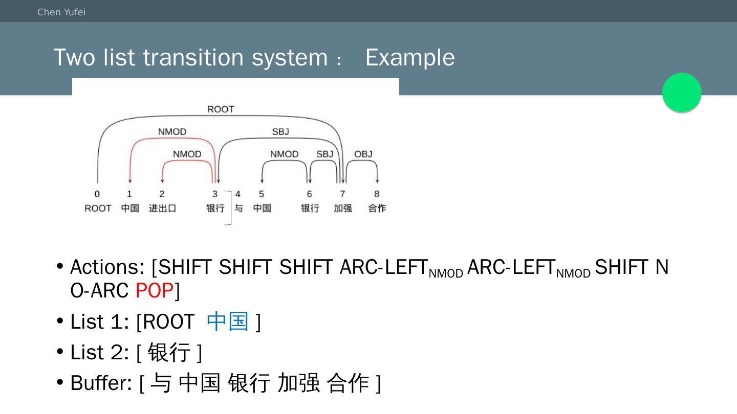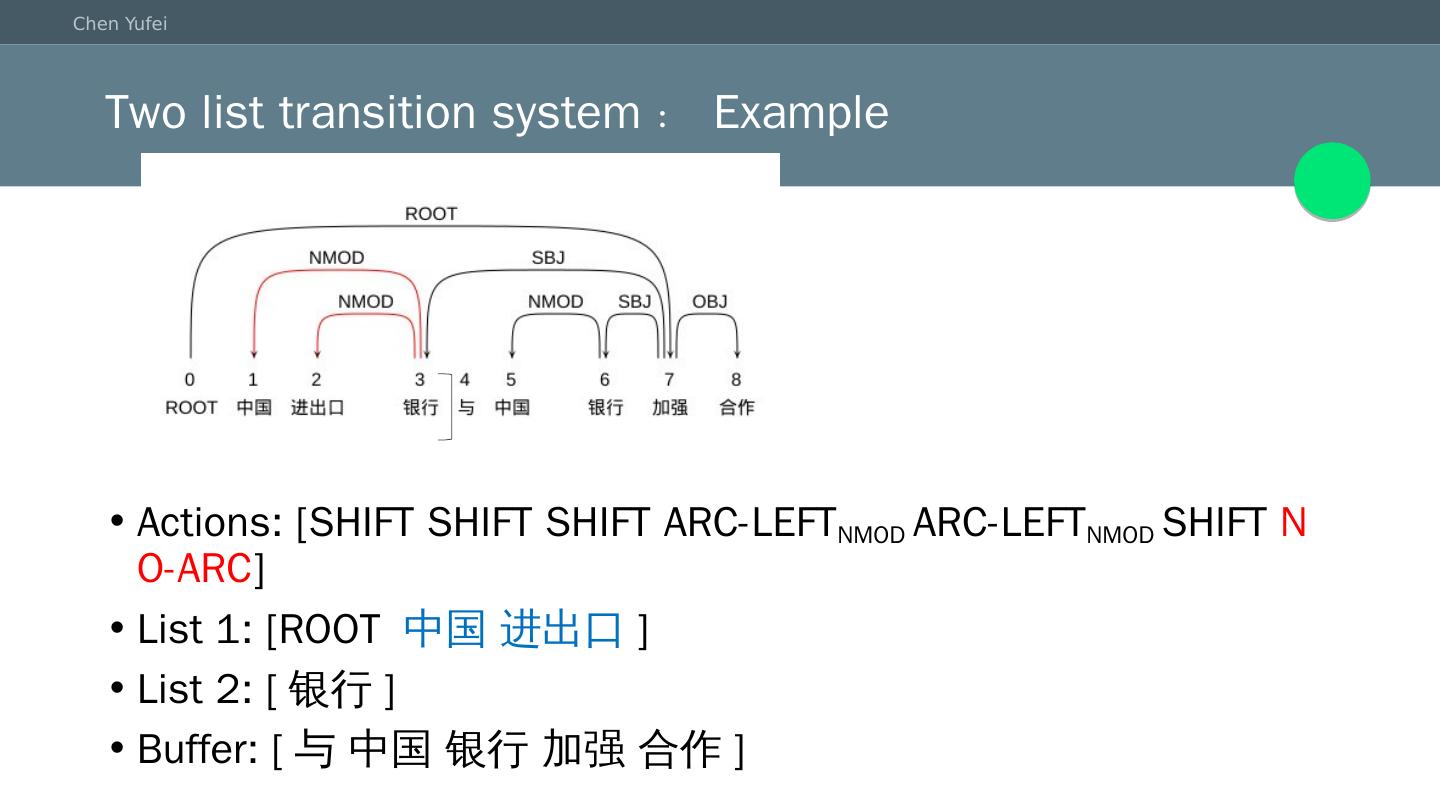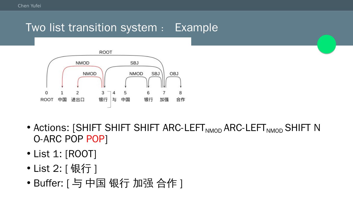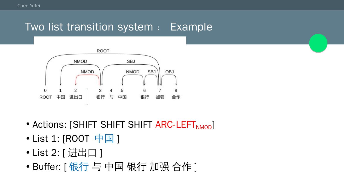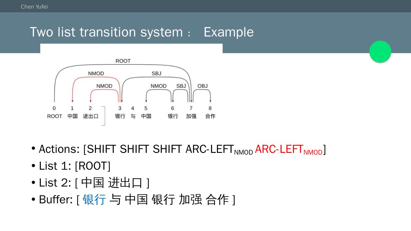 17 .Two list transition system:Example Actions: [SHIFT SHIFT SHIFT ARC-LEFT NMOD ARC-LEFT NMOD ] List 1: [ROOT] List 2: [ 中国 进出口 ] Buffer: [ 银行 与 中国 银行 加强 合作]
