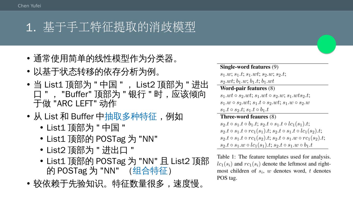 23 .1. 基于 手工特征提取 的消歧模型 通常 使用简单的线性模型 作为分类器。 以基于 状态转移 的依存分析为例。 当List1顶部为"中国",List2顶部为"进出口","Buffer"顶部为"银行"时,应该倾向于做"ARC LEFT"动作 从List和Buffer中 抽取多种特征 ,例如 List1顶部为"中国" List1顶部的POSTag为"NN" List2顶部为"进出口" List1顶部的POSTag为"NN"且List2顶部的POSTag为"NN" ( 组合特征 ) 较依赖于先验知识 。特征数量很多,速度慢。