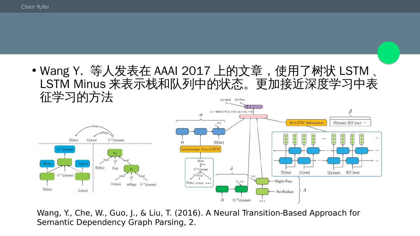 25 .Wang Y. 等人发表在AAAI 2017上的文章,使用了树状LSTM、LSTM Minus来表示栈和队列中的状态。更加接近深度学习中表征学习的方法 Wang, Y., Che, W., Guo, J., & Liu, T. (2016). A Neural Transition-Based Approach for Semantic Dependency Graph Parsing, 2.